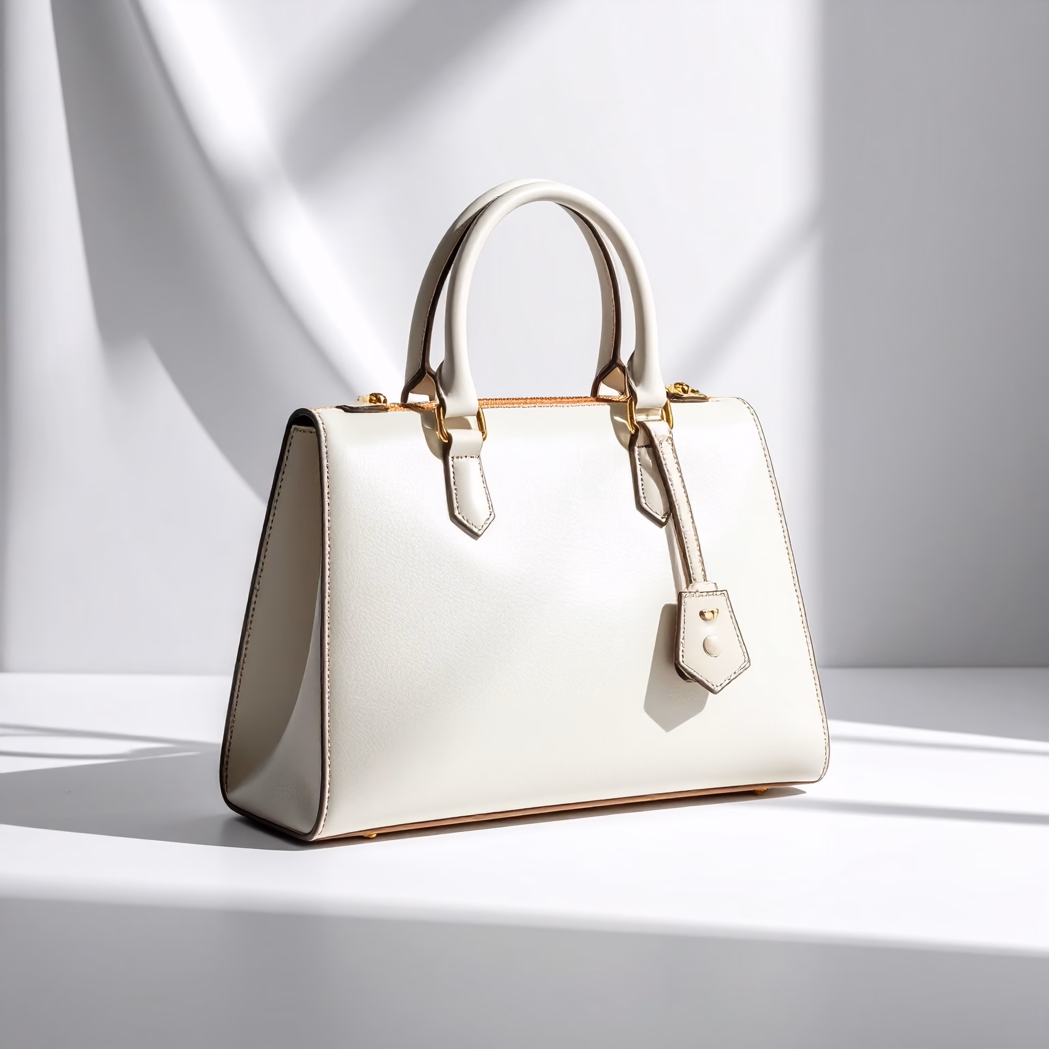 Discover this elegant cream leather handbag, beautifully showcased on a light surface. Soft lighting enhances its sophisticated design and golden details. The minimalist composition from a three-quarter angle highlights its premium texture and finish, creating a modern and chic atmosphere. Perfectly