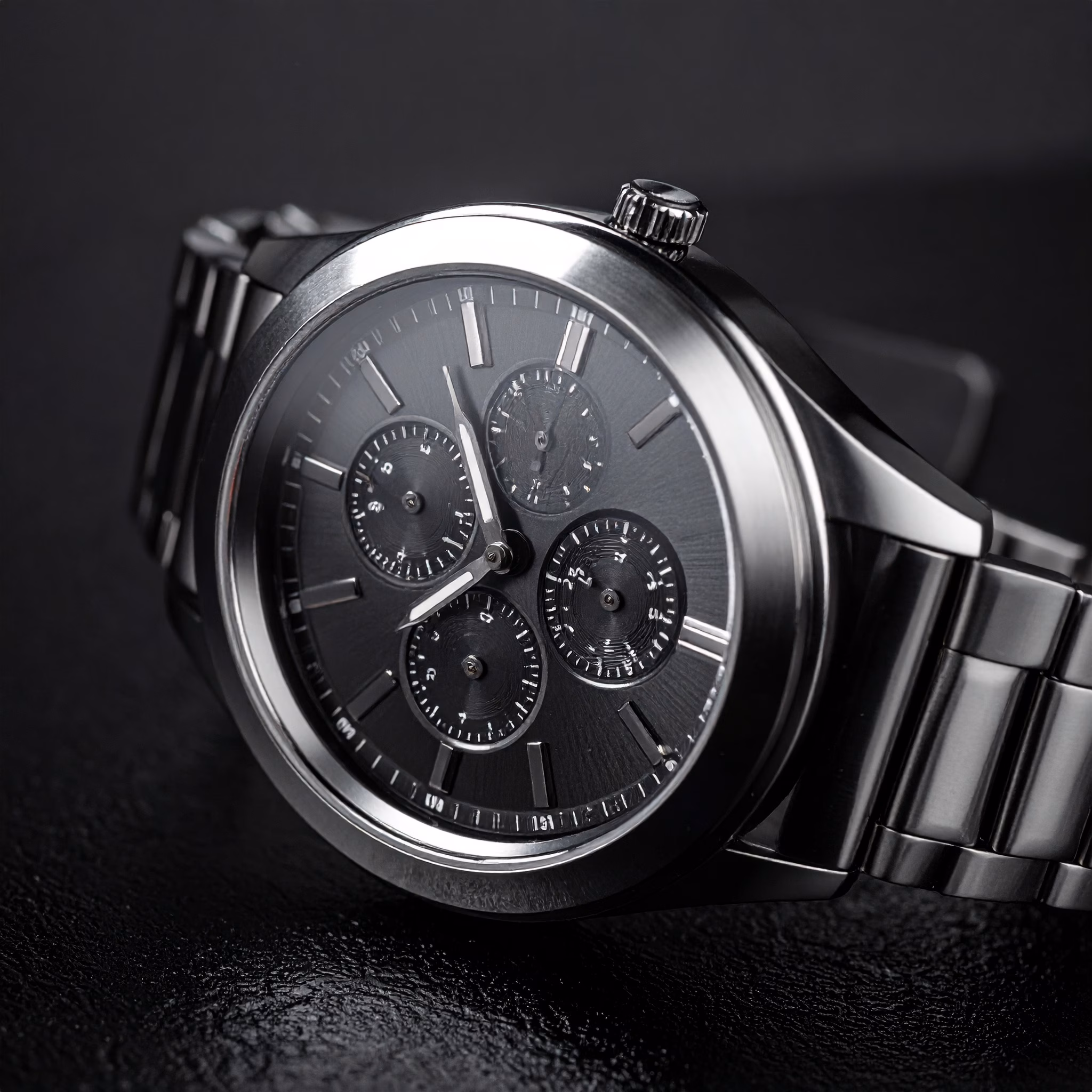 Close-up of a metal wristwatch featuring a black dial, showcasing its detailed subdials against a dark background. The soft lighting enhances the shine of the metal, giving it a sophisticated and mode...