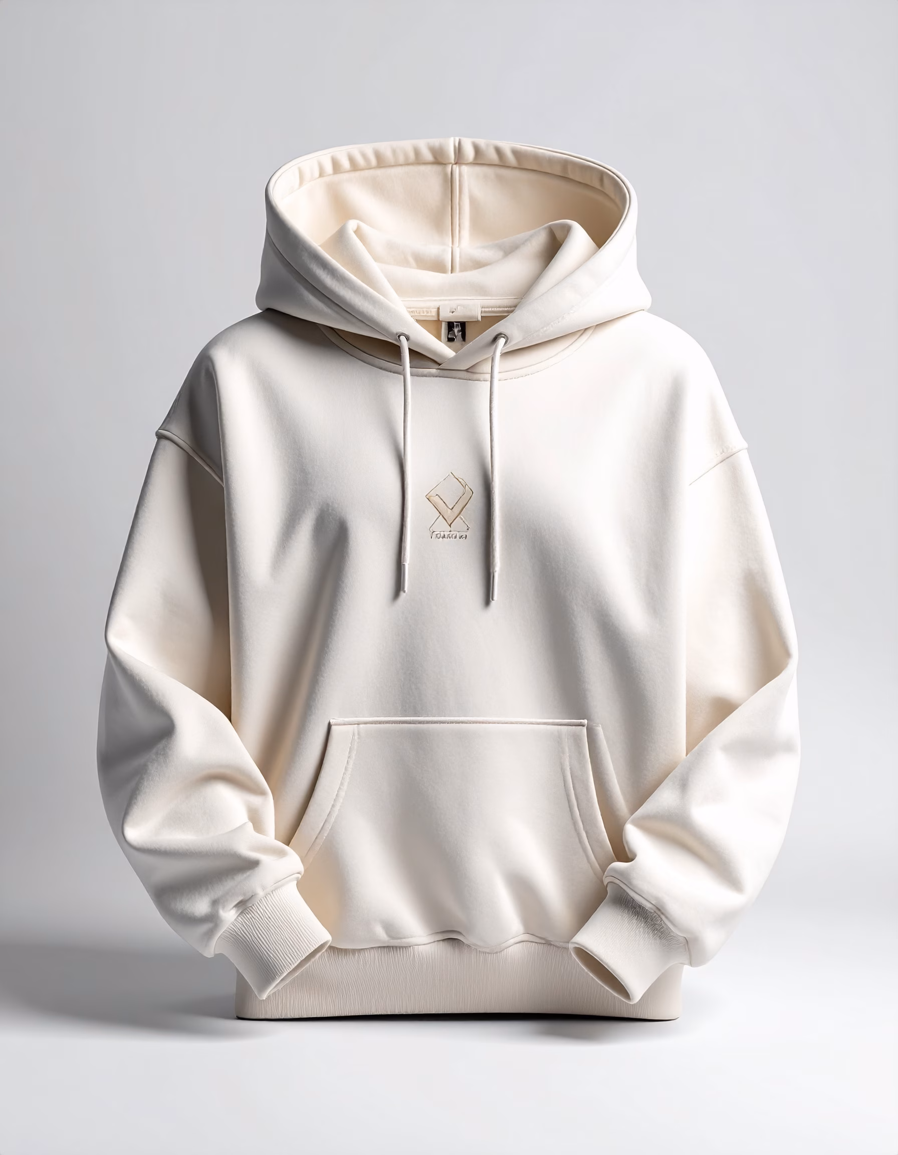 Discover this cream hoodie featuring a soft texture, white drawstrings, and an embroidered logo on the chest. The gentle lighting highlights its minimalist and modern design, making it a perfect addition to your wardrobe.