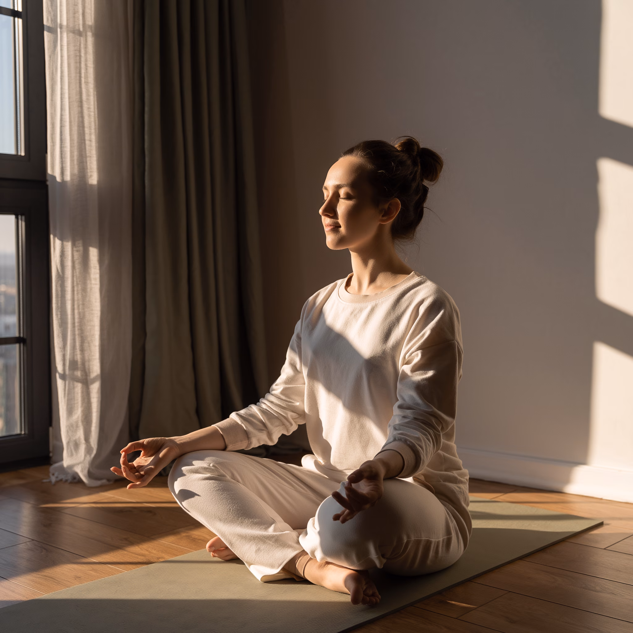 A woman meditating in a lotus position in a sunlit room, radiating calm and serenity. This cozy environment is perfect for mindfulness practices and self-care routines.