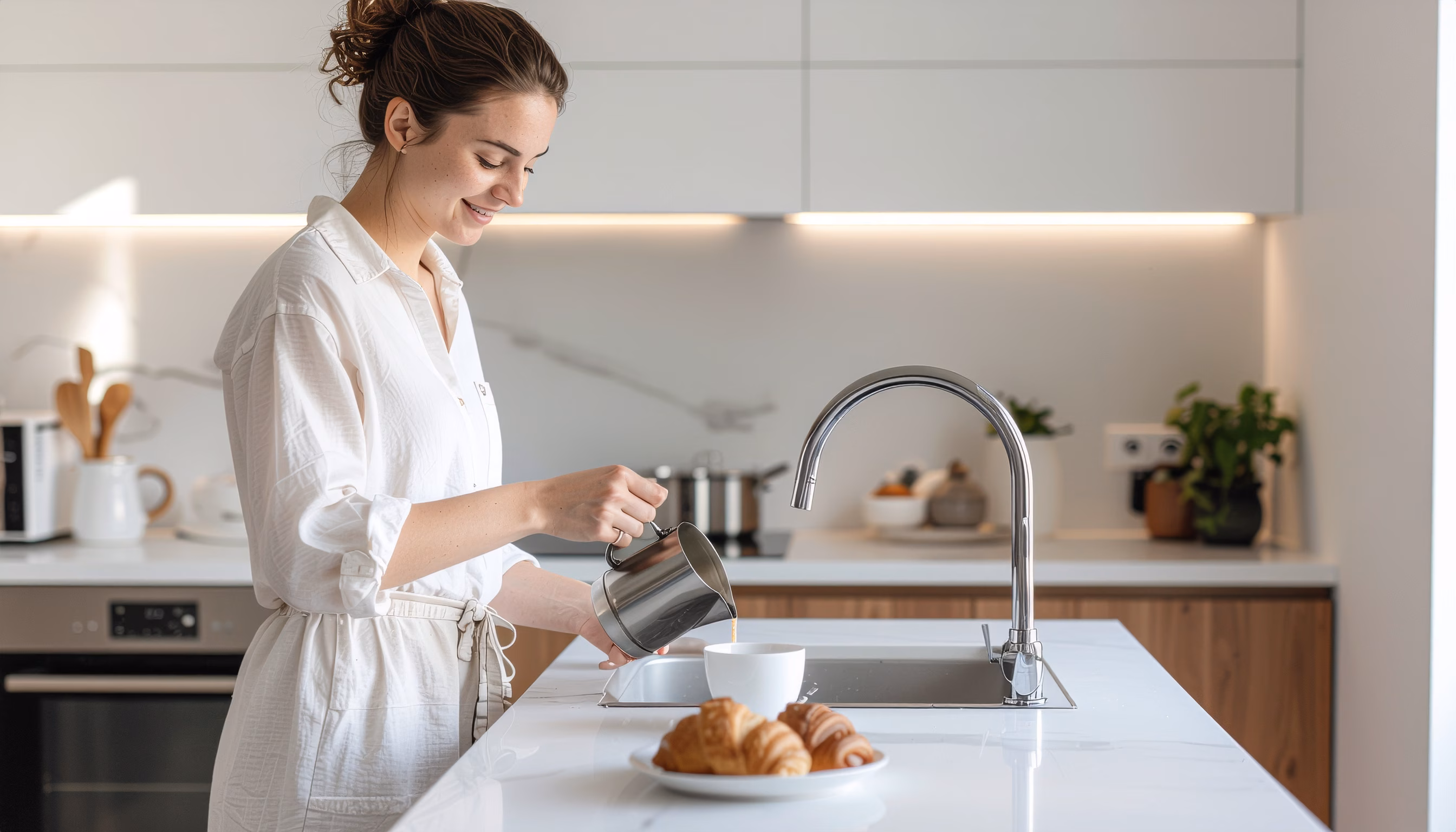 A smiling woman in a modern kitchen, wearing a white apron, prepares coffee. Soft lighting highlights the minimalist decor with a white countertop and chrome faucet. The cozy atmosphere features a decorative plant in the background and croissants in the foreground, creating a serene morning scene.