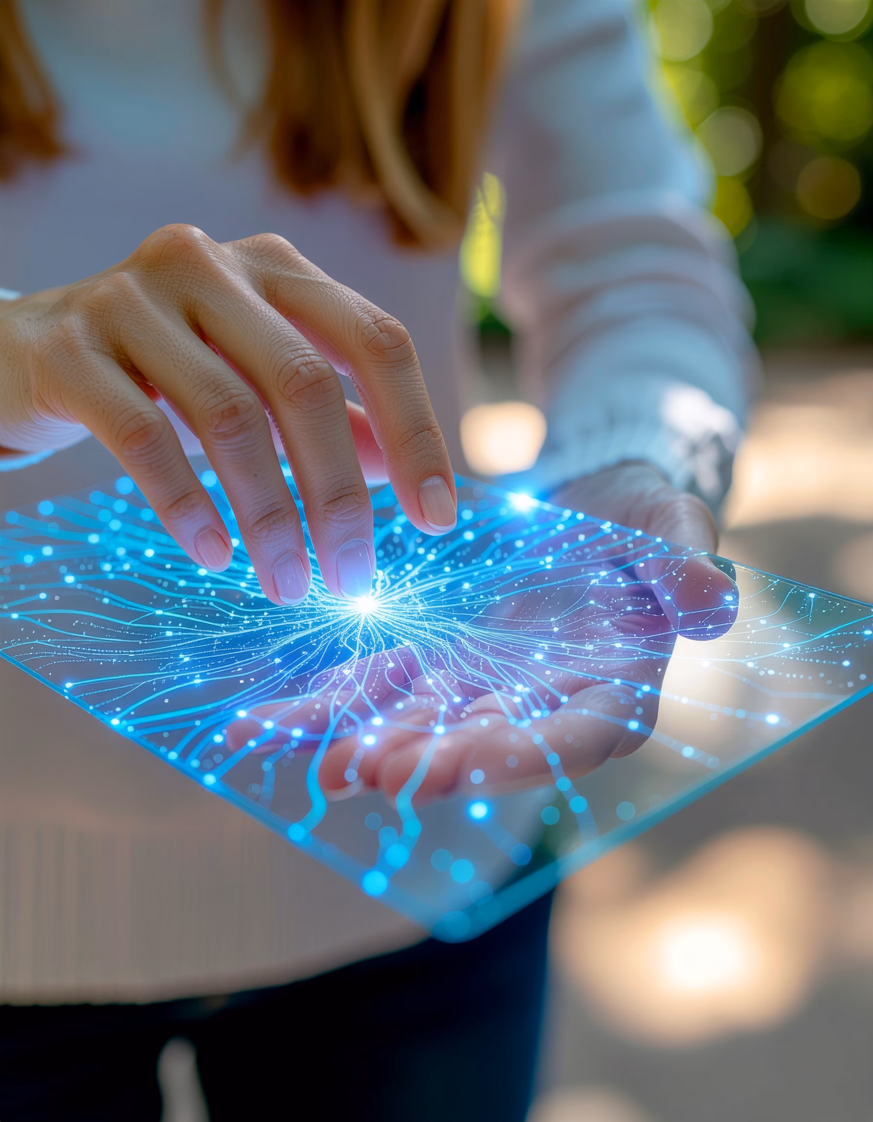 A female hand interacts with a translucent digital surface, emitting blue luminous patterns in a blurred natural environment. This image creates a striking contrast between advanced technology and nature, featuring a centered composition with selective focus.