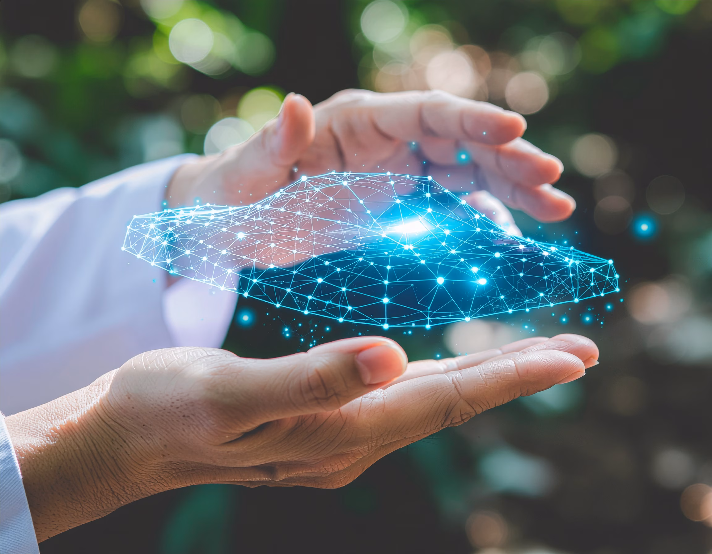 Hands holding a hologram of a car in a digital network, symbolizing innovation in automotive technology. The background features a blurred natural setting with a futuristic luminous effect, perfect for showcasing cutting-edge automotive concepts.
