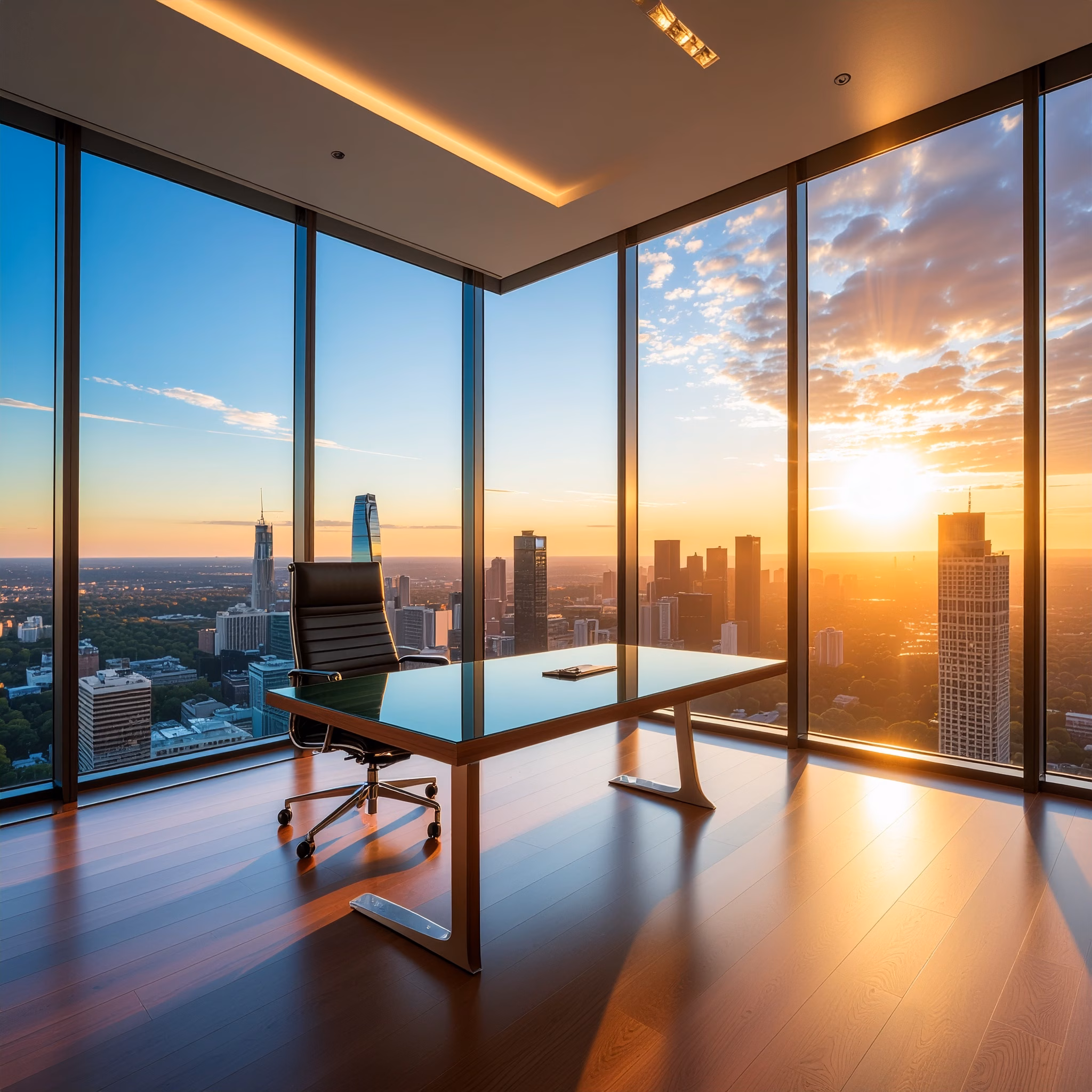 Discover a modern office located in a skyscraper featuring floor-to-ceiling glass windows that provide a stunning panoramic view of the city at sunset. The space is bathed in natural light, casting soft shadows on the elegant wooden floor. A sleek glass desk and an executive chair complete the chic,