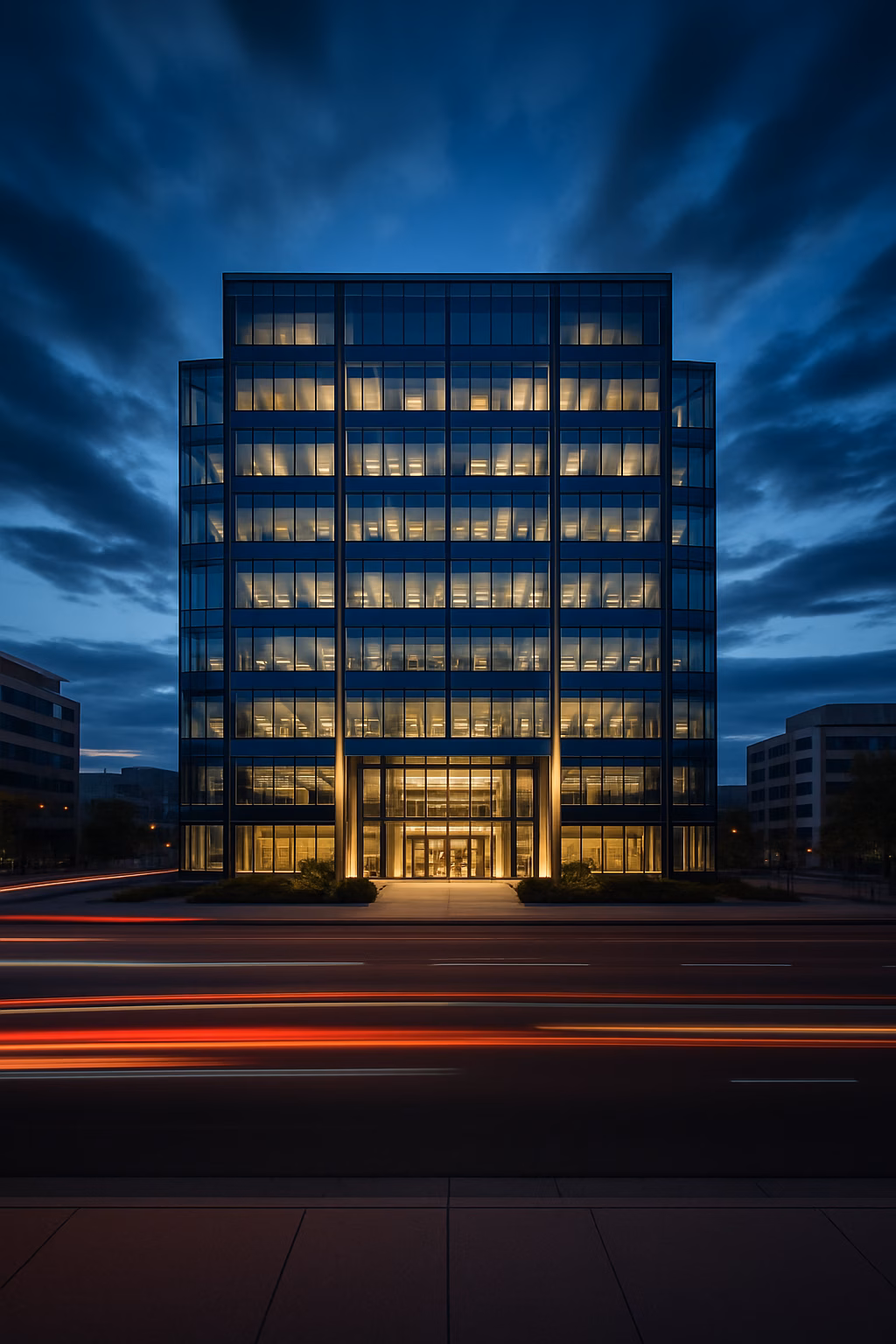 A modern glass building illuminated from within, captured at dusk. The warm light from the windows contrasts with the dark blue sky, while the light trails of moving cars create a vibrant dynamic in t...