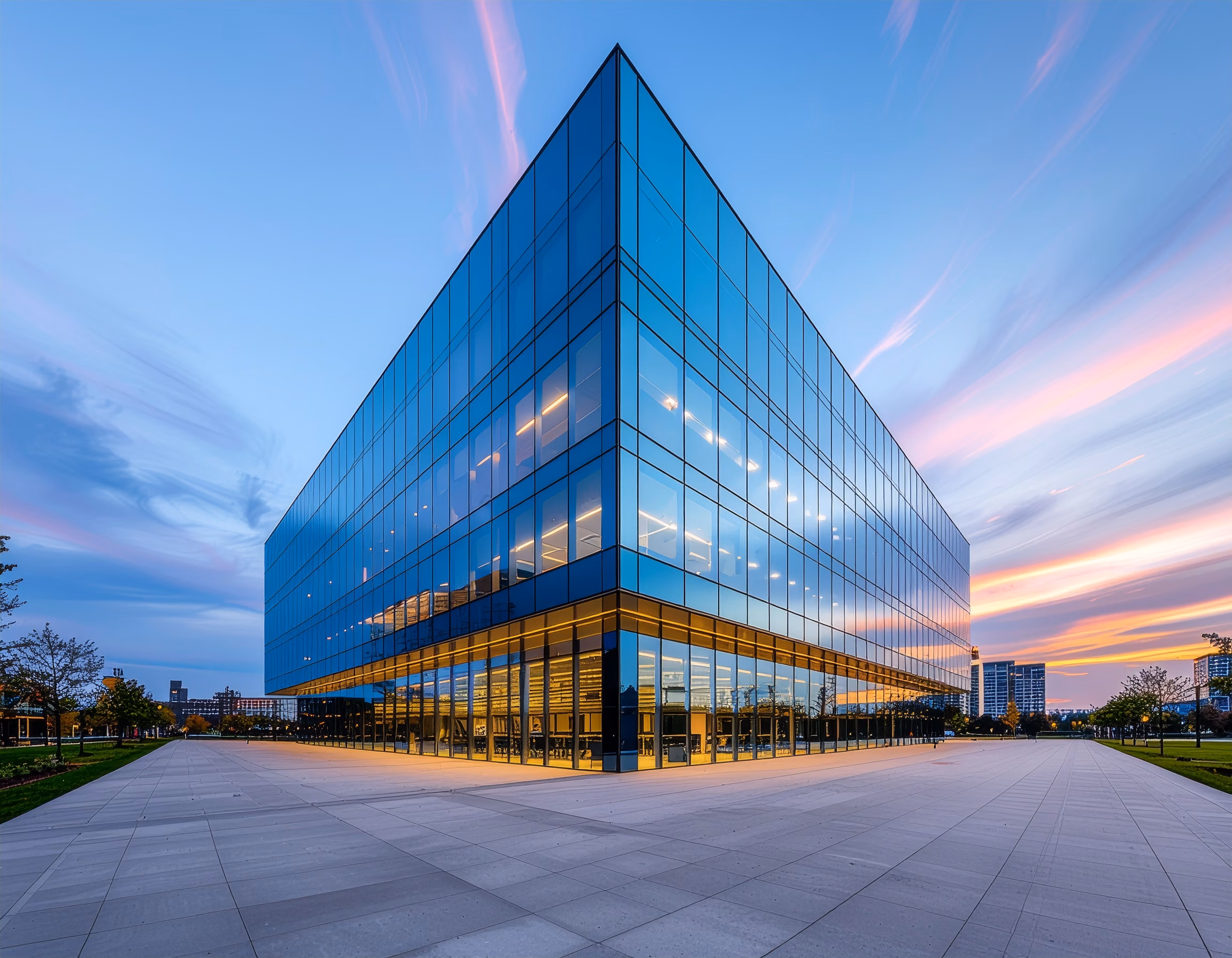 A stunning modern glass building reflecting the sunset sky, featuring contrasting internal lighting and precise architectural lines, situated in a spacious paved area, captured in a dramatic angular perspective. Perfect for showcasing contemporary architecture in your projects.
