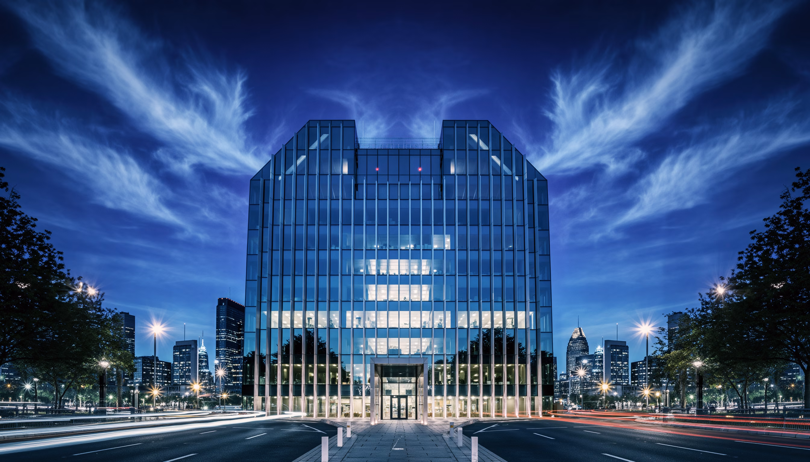 Explore this stunning modern glass building illuminated at night, located in the heart of a city. Surrounded by trees and a deep blue sky with wispy clouds, it creates a symmetrical composition and a ...