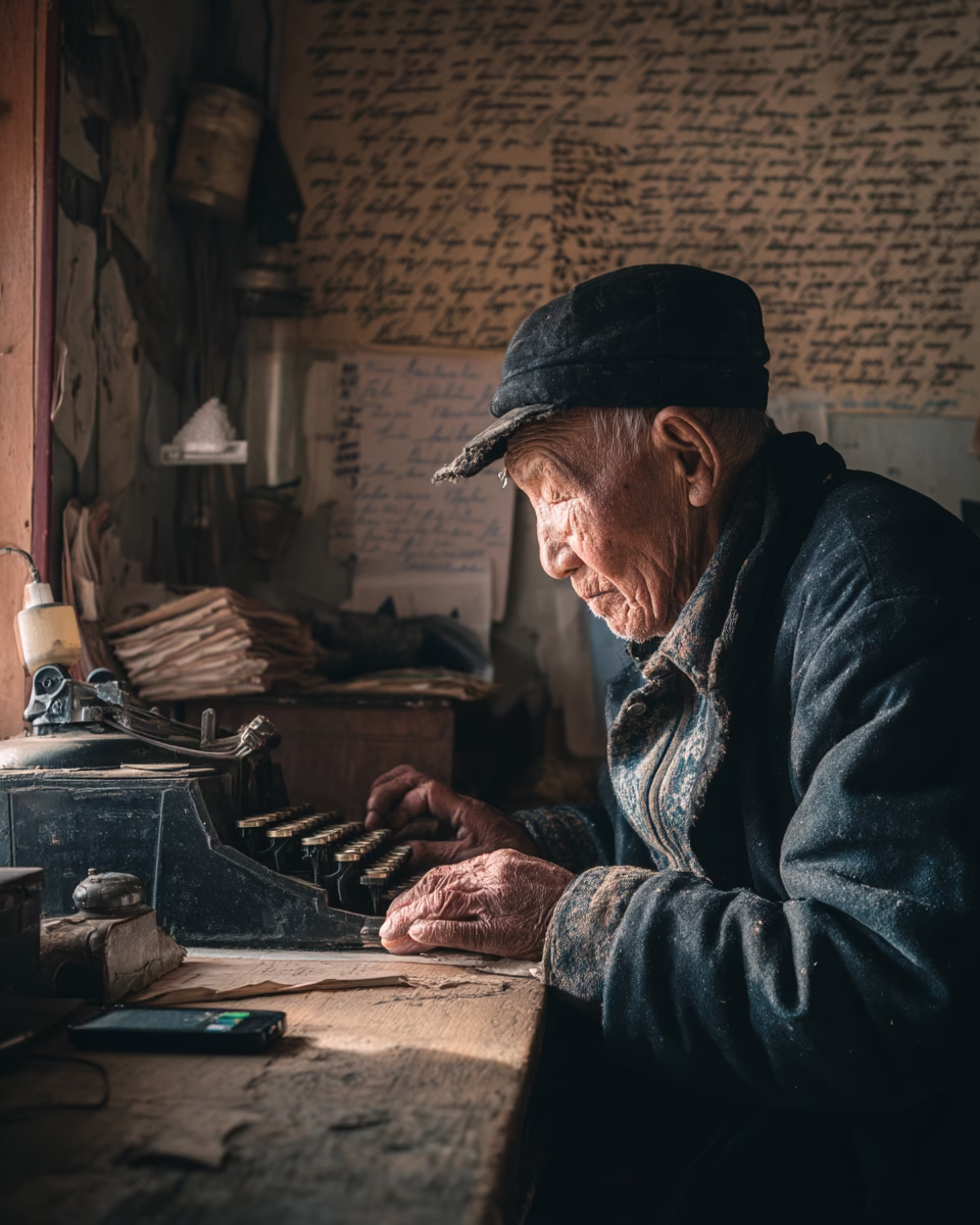 This image captures an elderly man deeply focused on a typewriter, set in a rustic and nostalgic environment. The predominant colors are earthy and neutral tones, with soft lighting that highlights th...