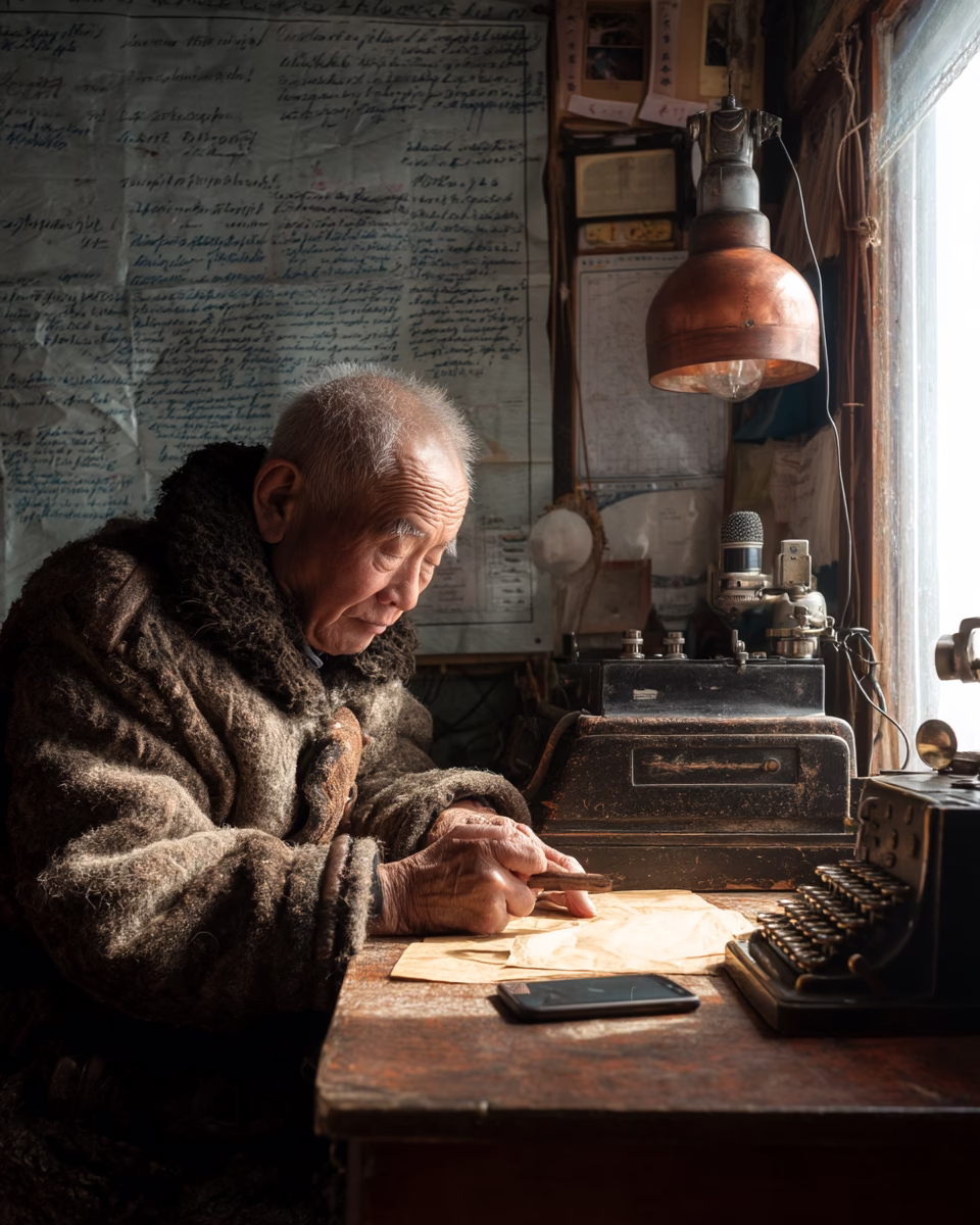 This image features an elderly man dressed in a dark fur coat, deeply focused on writing on yellowed sheets of paper. The soft lighting accentuates the textures of the coat and the wooden table. In the background, a wall covered with handwritten notes and papers enhances the atmosphere of an old, a