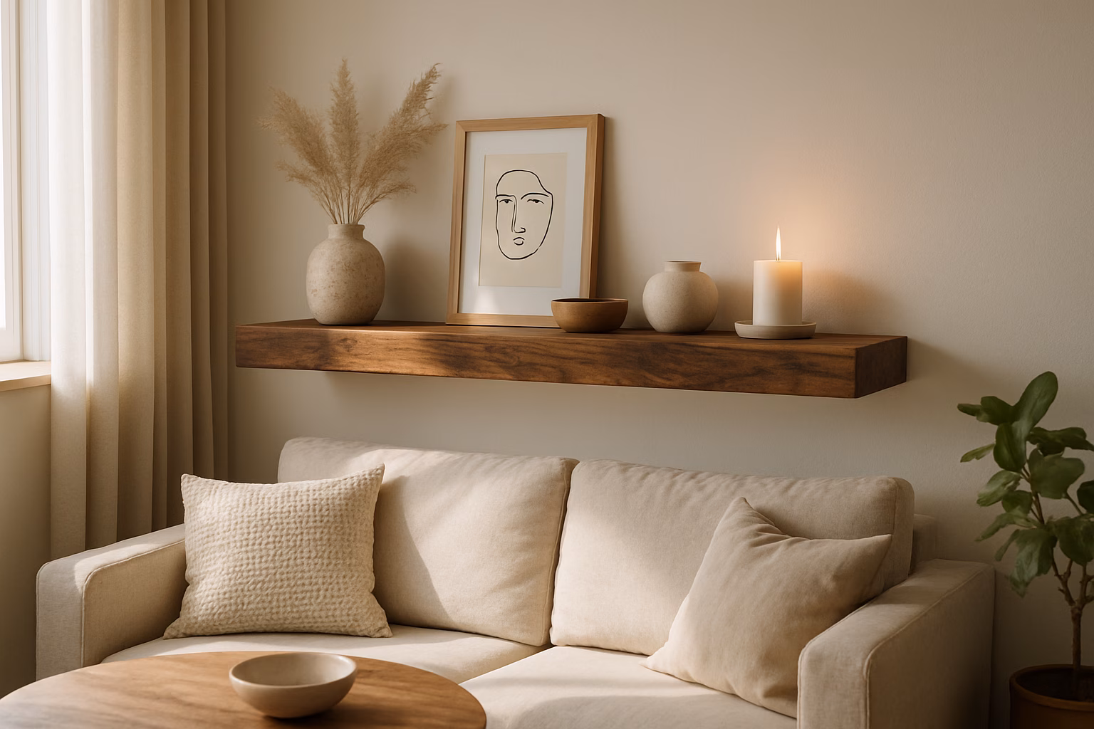 Discover a minimalist living room featuring a light sofa adorned with cushions, a wooden shelf showcasing elegant decor, including a vase with dried plants, framed artwork, and a lit candle. The soft, natural lighting enhances earthy tones, creating a cozy atmosphere perfect for any home.