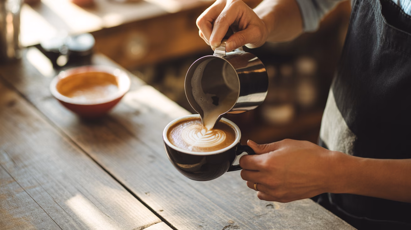A skilled barista carefully crafting latte art with steamed milk in a black cup on a rustic wooden table. Soft natural light filters through the window, highlighting the contrast between the coffee and cream. This scene evokes a warm and artisanal atmosphere, with a sharp focus on the cup and the sw