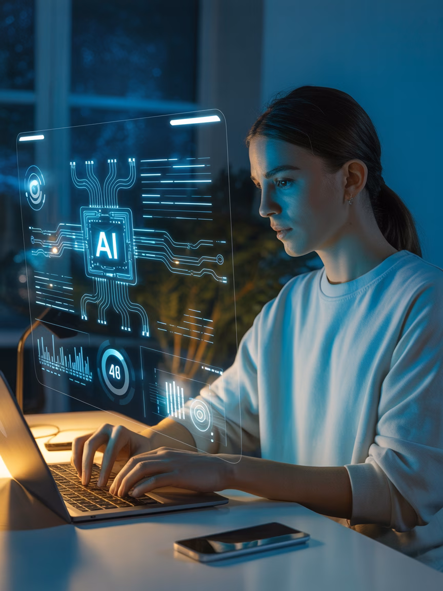A young woman is focused on her laptop in a modern setting, featuring digital holography highlighting 'AI'. The blue lighting creates a futuristic and technological atmosphere. The composition is cent...