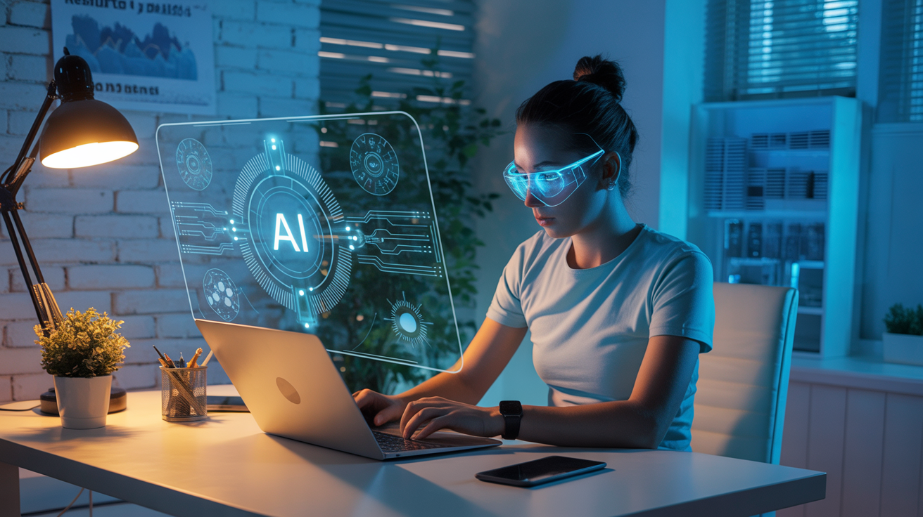 A woman wearing augmented reality glasses is working on a laptop in a modern, well-lit environment. The holographic screen displays an artificial intelligence interface. This nighttime scene features a bluish light and sharp focus, perfect for showcasing cutting-edge technology.