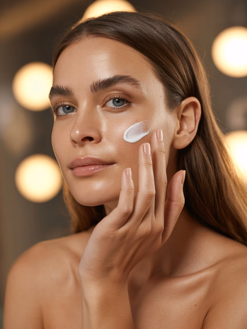 A woman applies moisturizer to her face in a close-up shot, highlighting her healthy and radiant skin in a well-lit and sophisticated environment. This image evokes personal care and natural beauty, perfect for promoting skincare products.