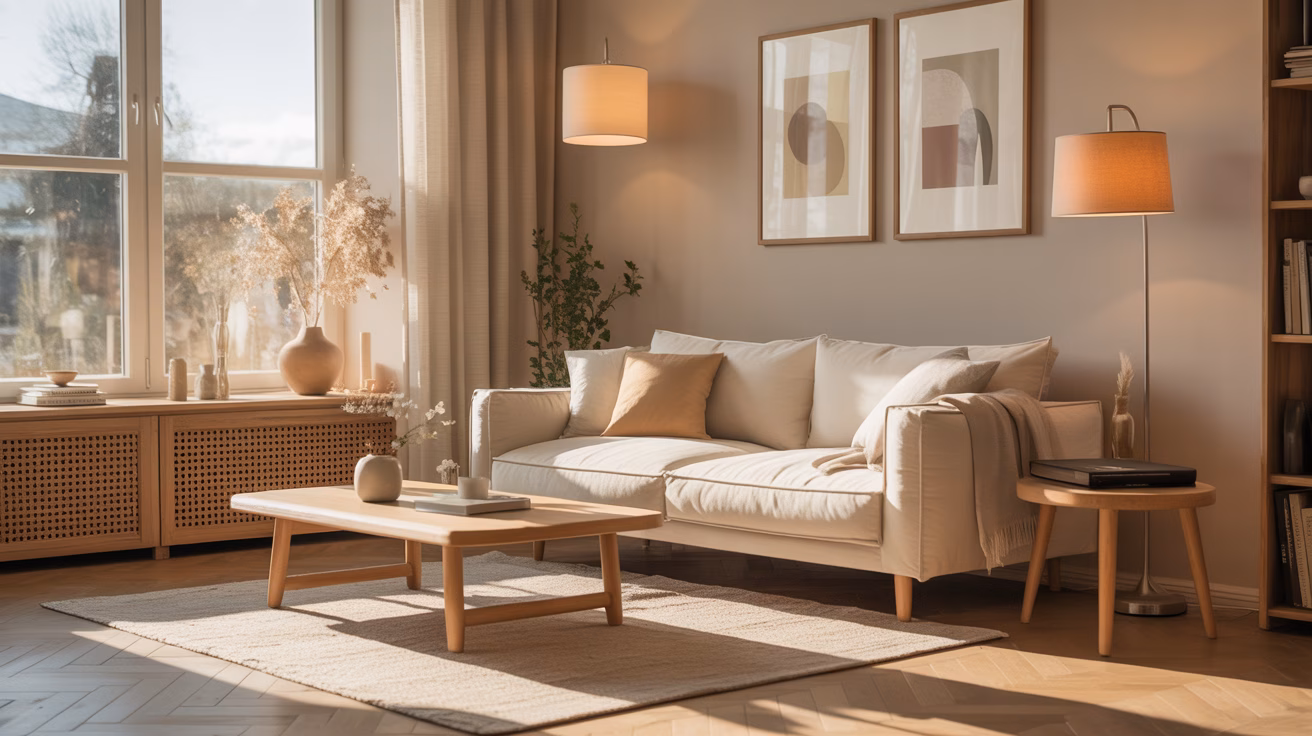 Elegant Living Room with Cozy Beige Sofa