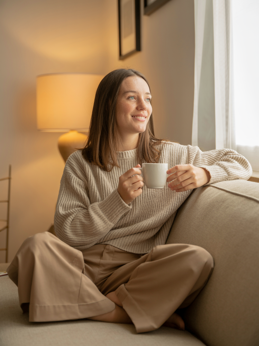 A serene woman sits on a beige sofa, holding a cup, as soft light filters through the window, creating a cozy atmosphere. The warm glow from the lamp in the background enhances the feeling of comfort and tranquility. The space is decorated in a minimalist style, featuring predominant neutral tones.