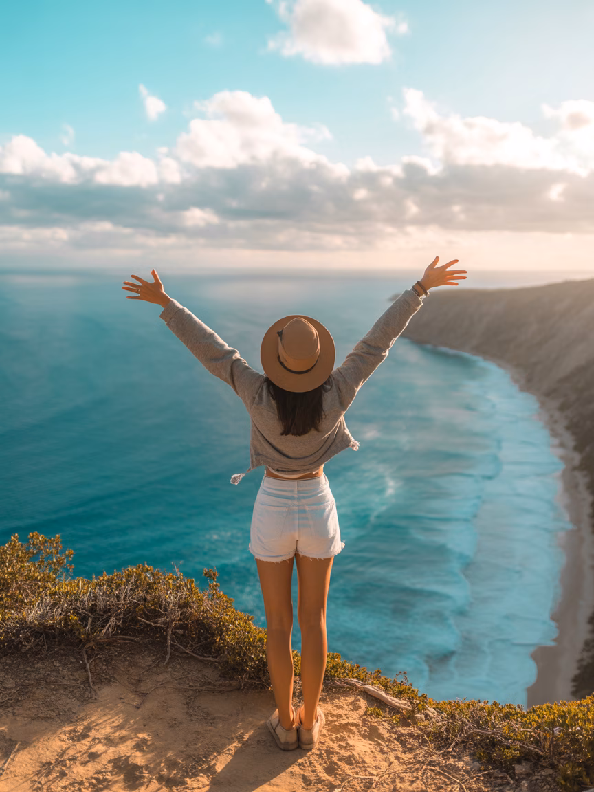 A woman wearing a hat admires the breathtaking ocean view from a cliff, embodying freedom and adventure on a sunny summer day. Perfect for travel and lifestyle themes, this image captures the essence of exploration and nature's beauty.