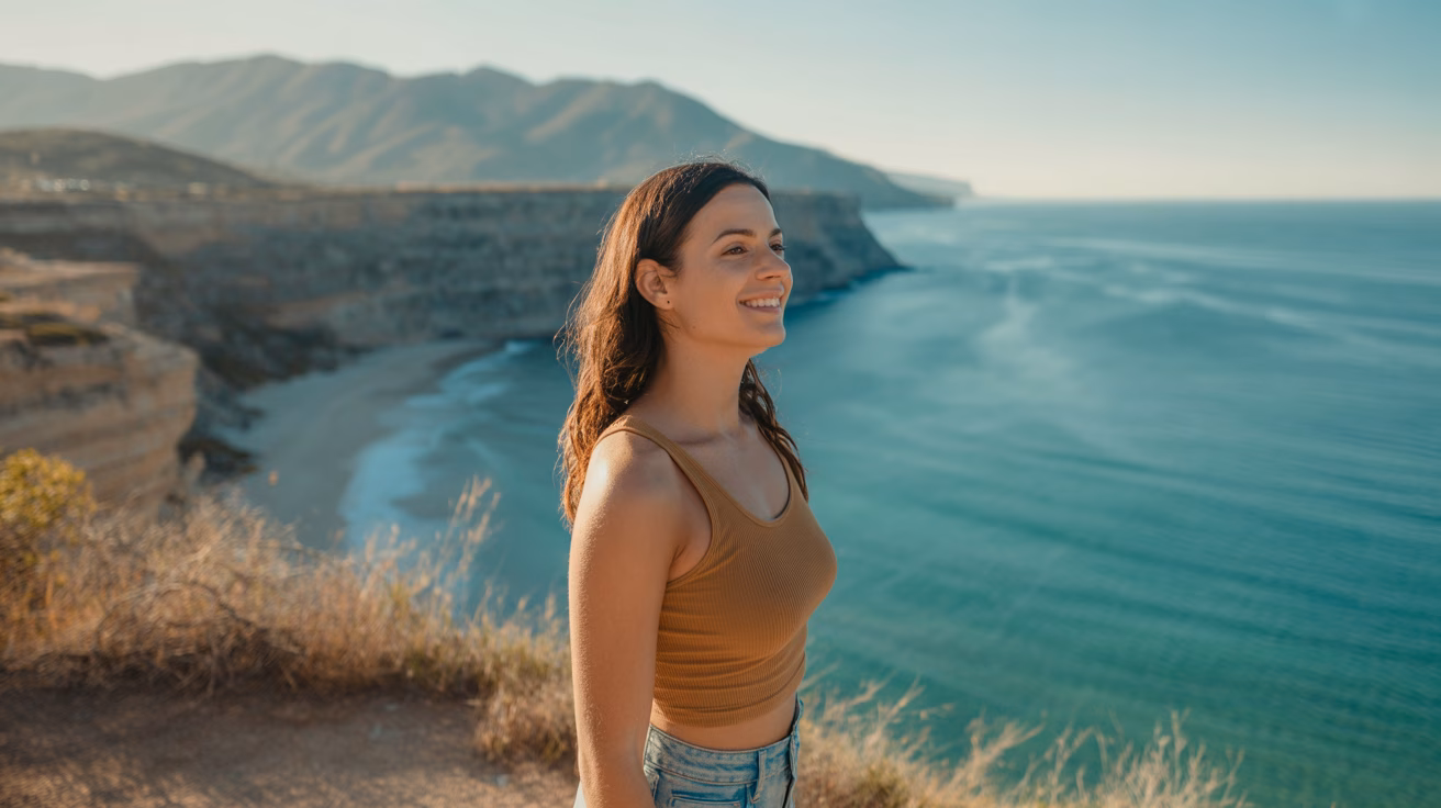 A smiling woman stands on a cliff with a breathtaking view of the blue sea and mountains in the background, illuminated by the soft light of sunset. This scene conveys serenity and natural beauty, sho...