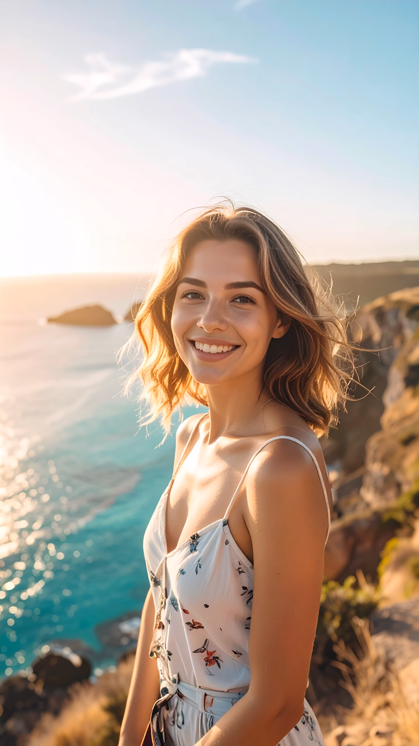 A smiling young woman in a floral dress poses on a seaside cliff during sunset, surrounded by crystal-clear blue waters and a clear sky, evoking serenity and natural beauty. Perfect for those looking ...