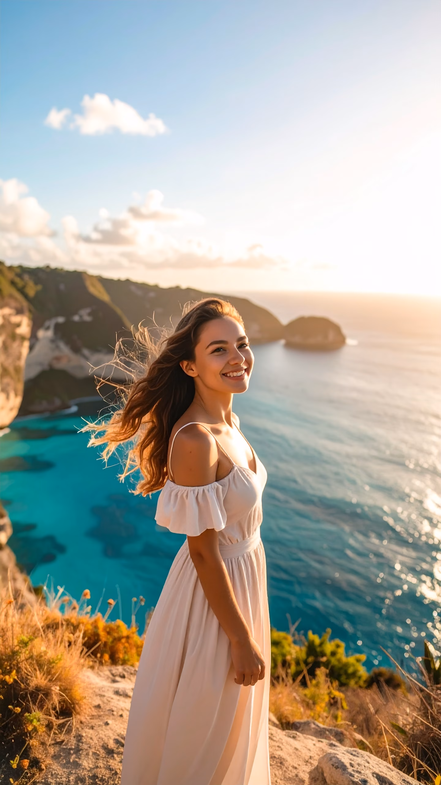 Smiling Woman in White Dress on Cliff Overlooking Crystal Clear Waters at Sunset