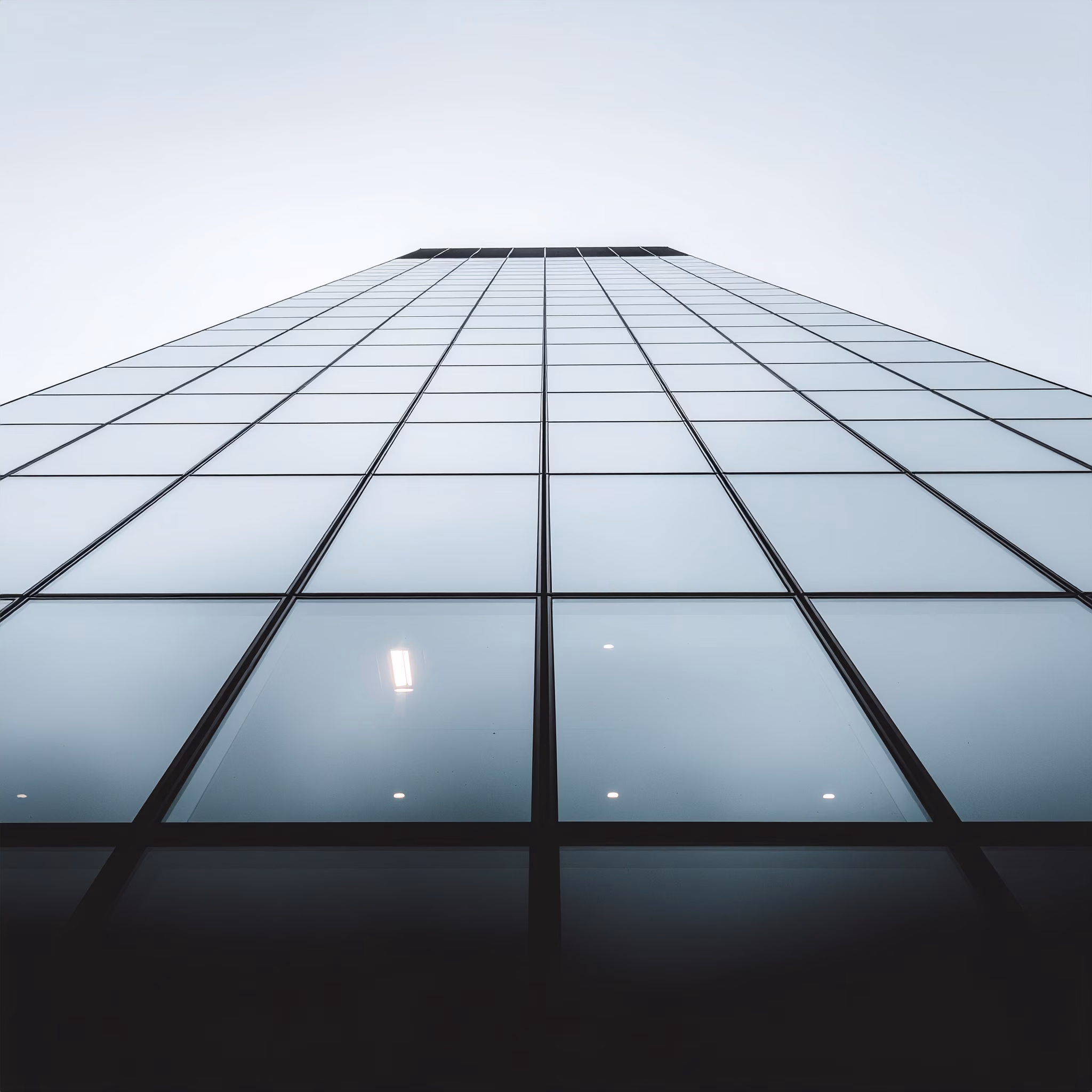 Experience the stunning view of a modern skyscraper featuring a glass facade, captured from a low angle that emphasizes its impressive height against a clear sky. The symmetry of the windows creates a mesmerizing visual effect, highlighting the sharp vertical and horizontal lines. Soft, diffused, mo