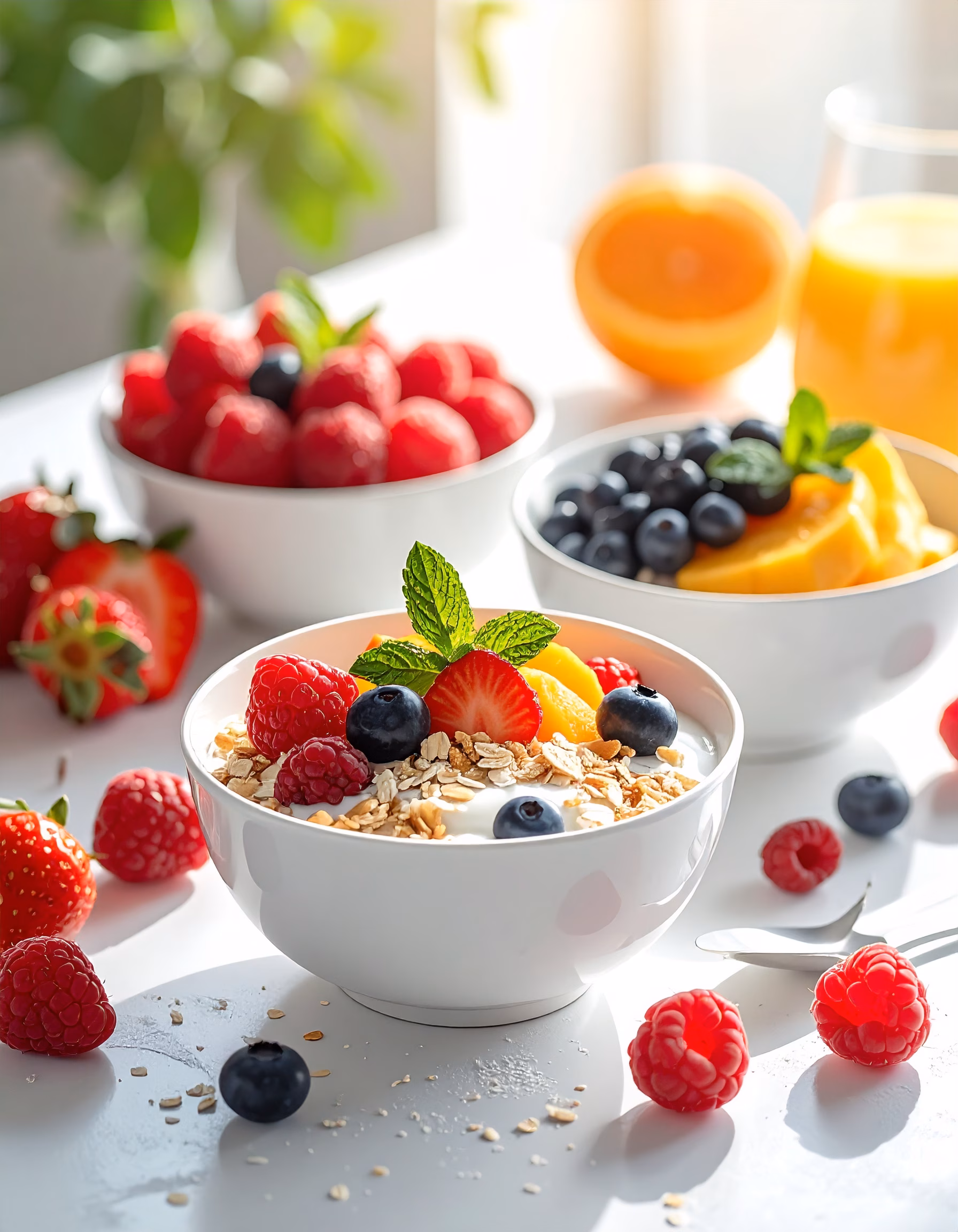 Bright and colorful bowls of fresh fruits and yogurt topped with granola, beautifully arranged on a table bathed in soft natural light. This vibrant scene features strawberries, raspberries, blueberries, and orange slices, evoking a sense of freshness and health. The sunlight enhances the textures,