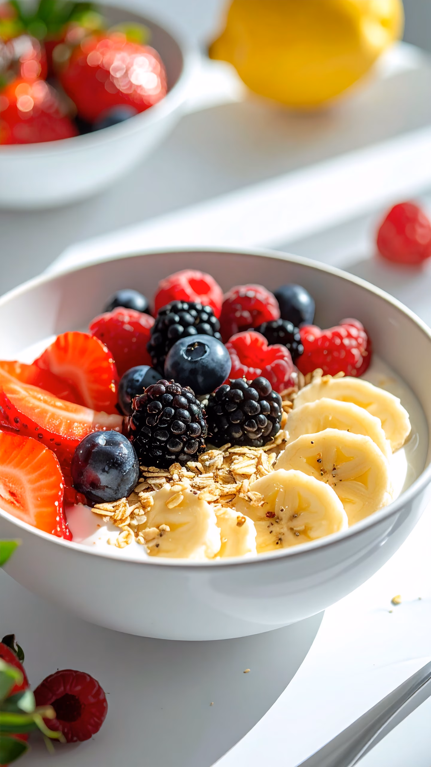 Discover a vibrant yogurt bowl topped with fresh strawberries, blackberries, raspberries, and bananas, beautifully presented under soft natural light. The contrasting colors highlight the textures of ...