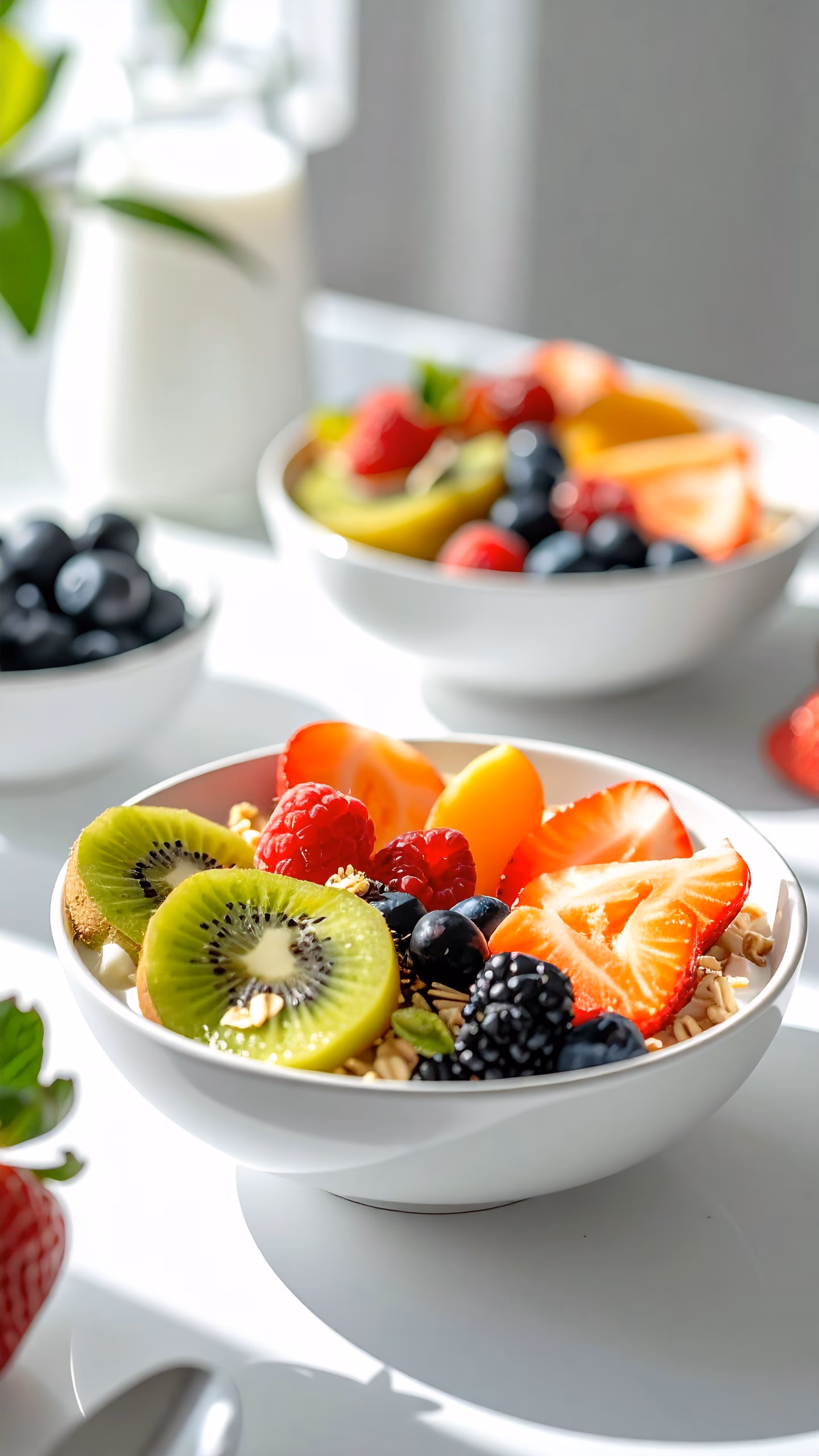 Discover vibrant and fresh fruit bowls featuring strawberries, kiwis, and blueberries on a crunchy cereal base. The soft, natural light enhances the vivid colors of the ingredients, creating a healthy...