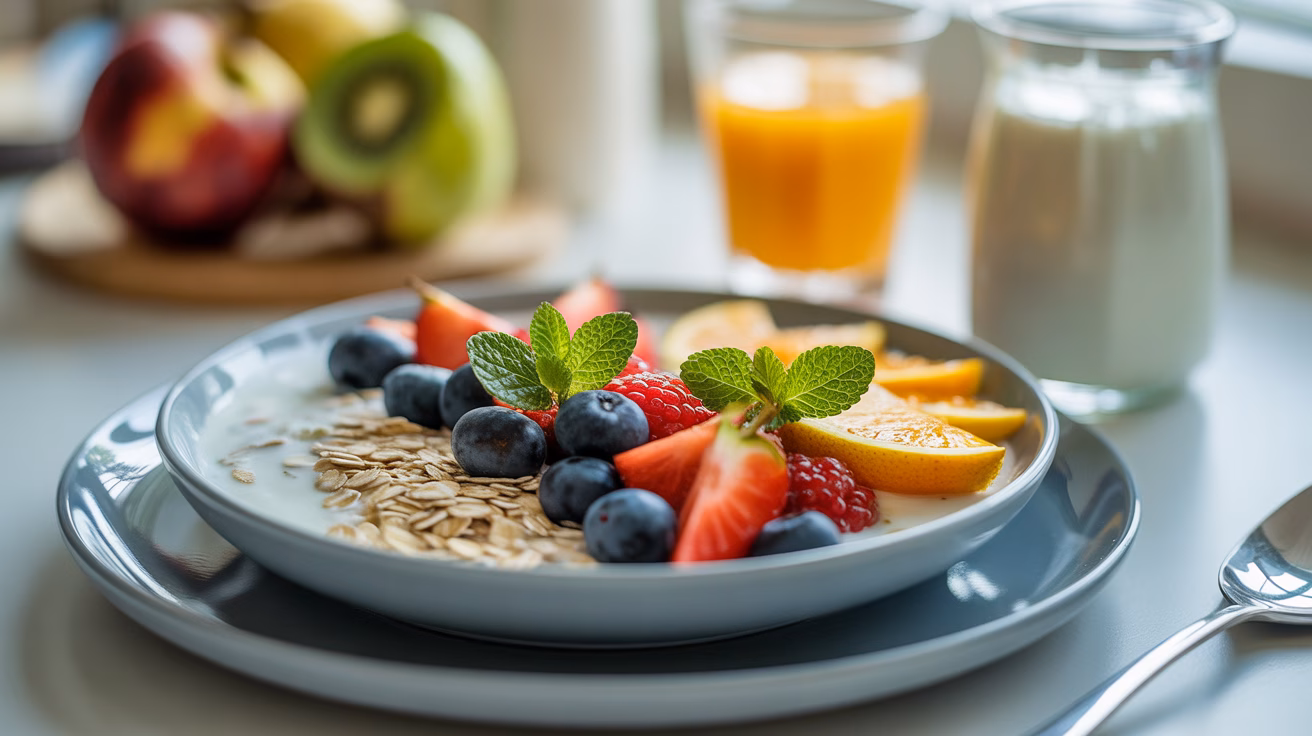 A vibrant yogurt bowl topped with fresh fruit slices including strawberries, blueberries, raspberries, and oranges, garnished with mint leaves. In the background, a glass of orange juice and a pitcher of milk are arranged in a softly lit morning setting. This image conveys freshness and health, with