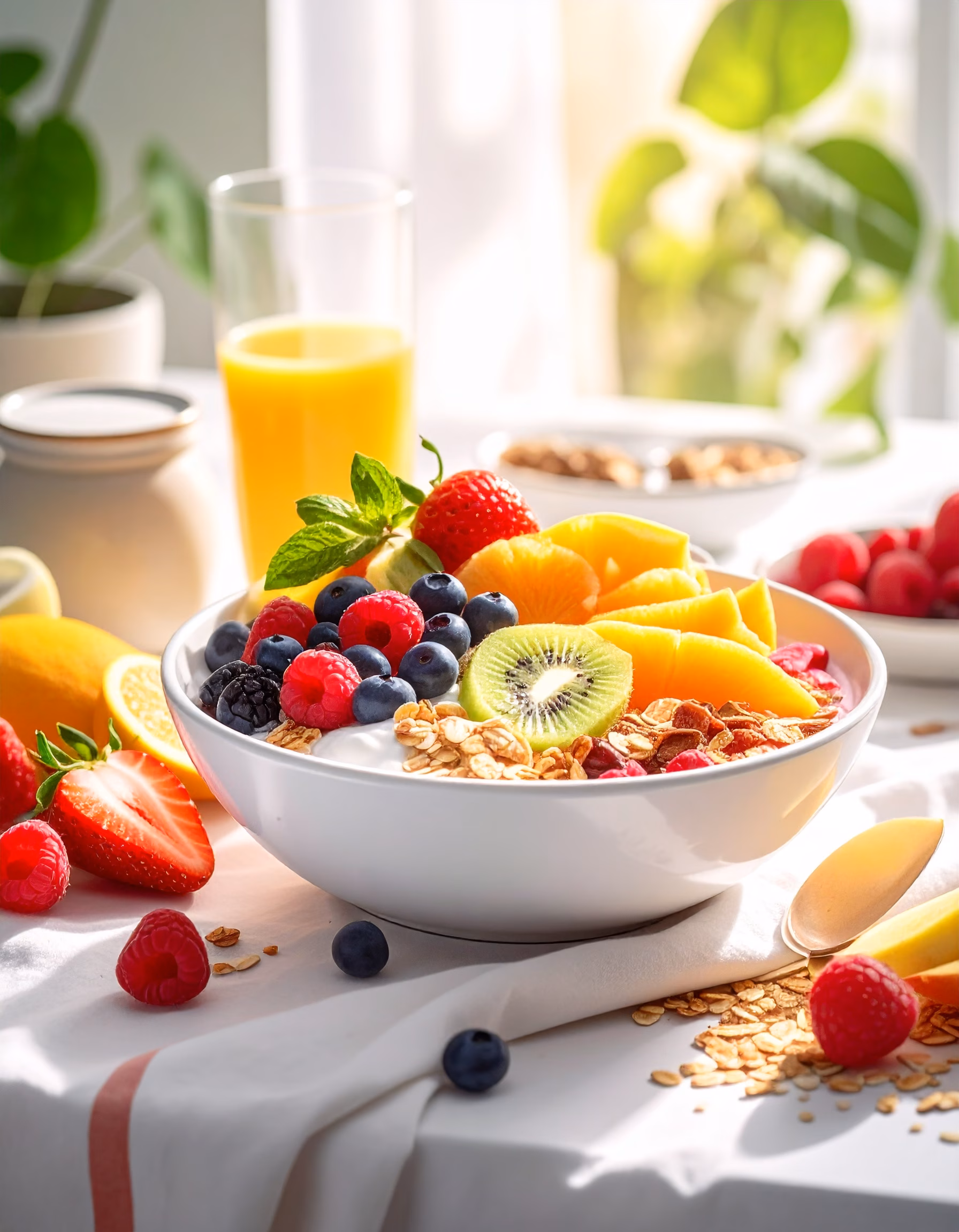 A vibrant yogurt bowl topped with fresh fruits and granola, beautifully arranged on a table bathed in soft natural light. The colorful mix includes strawberries, kiwi, blueberries, and raspberries, cr...