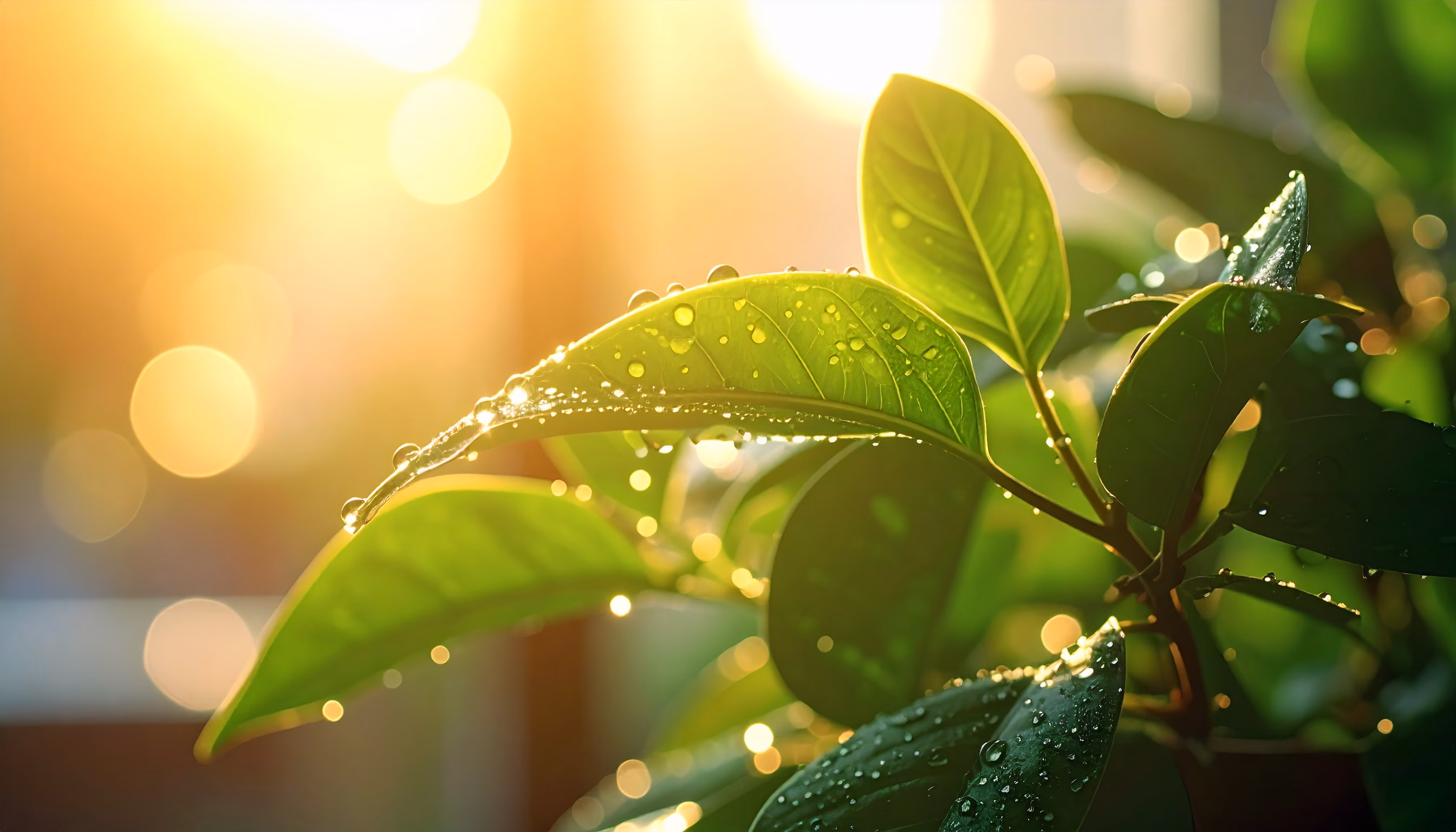 Experience the beauty of green foliage illuminated by the setting sun, showcasing dewdrops on the leaves. The soft, golden lighting creates a gentle bokeh effect in the background, evoking a tranquil and serene atmosphere. This composition focuses on the intricate details of the leaves and droplets,