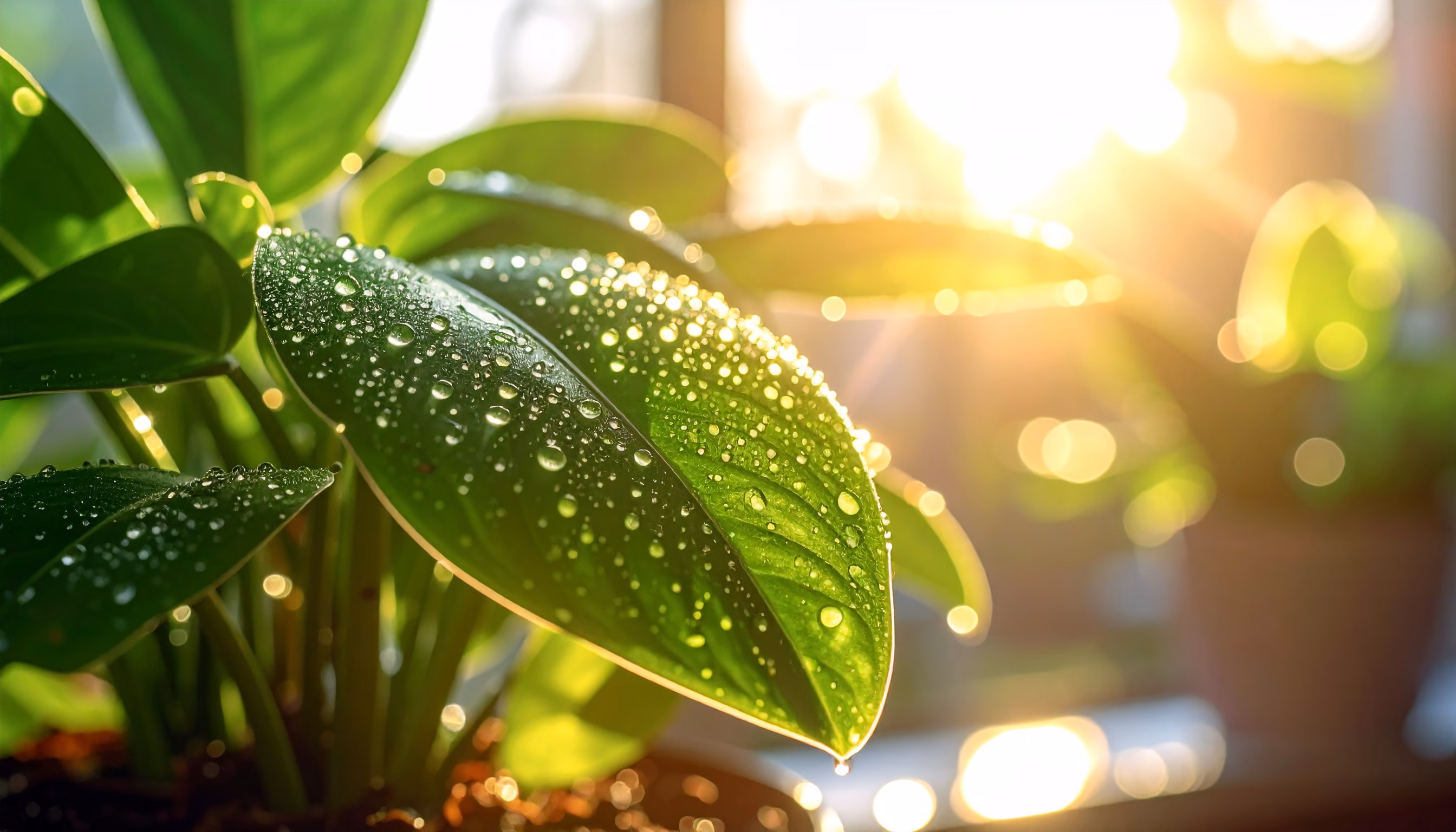 Green leaves covered in dew drops glisten under the golden sunlight, creating a shimmering effect. This composition highlights the freshness and vitality of the plants, with a soft focus and shallow depth of field, set in a serene morning atmosphere.