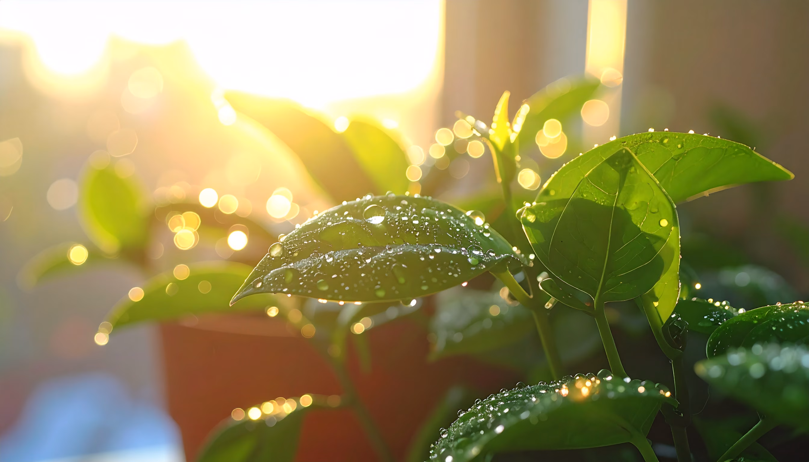 This image is classified with the tags: green leaves, dew drops, morning light, bokeh effect, nature.