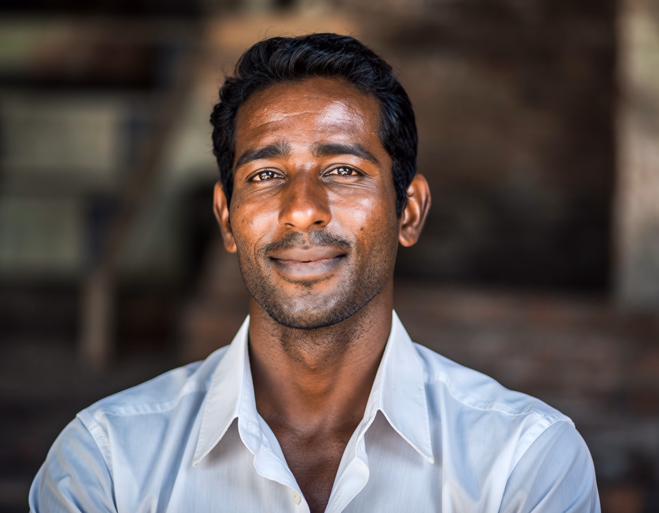 This portrait features a smiling man wearing a white shirt, sharply focused against a blurred dark background. The soft lighting accentuates his facial expressions, creating a friendly and welcoming a...