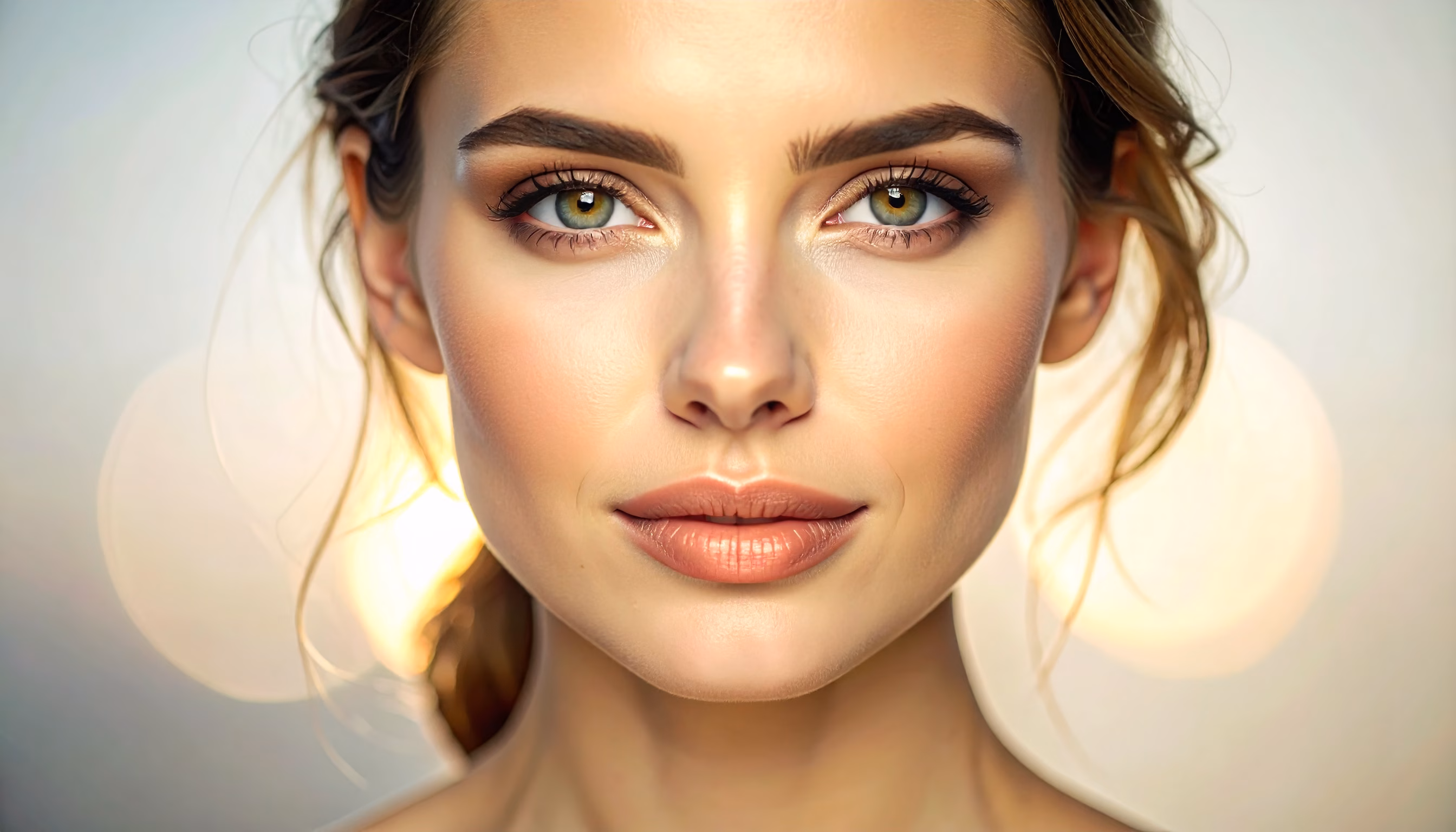 This close-up portrait features a woman with soft makeup, highlighting her green eyes and radiant skin. The background light creates a gentle bokeh effect, enhancing the symmetrical composition and he...