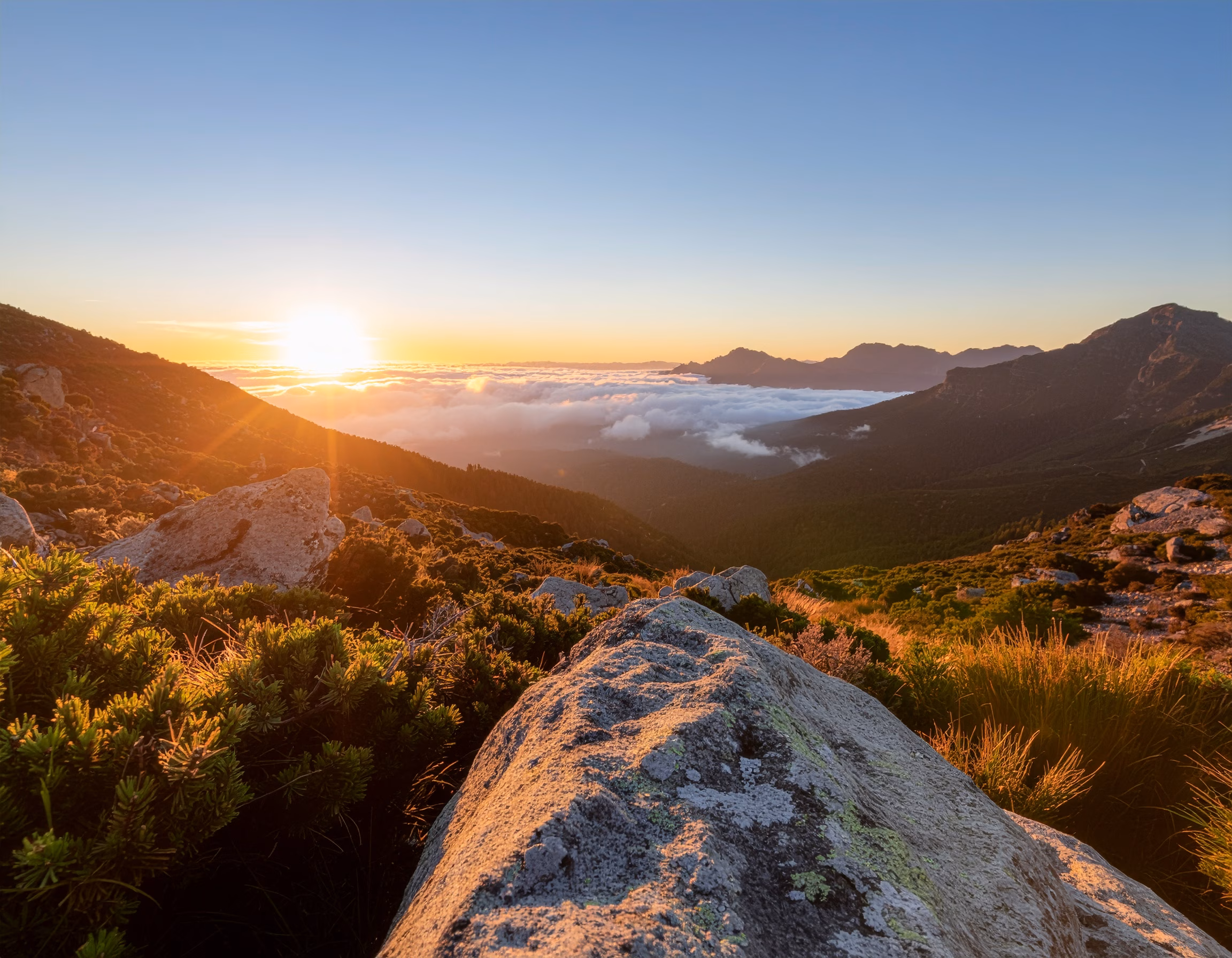 Experience a breathtaking sunrise illuminating a mountain landscape, with dense clouds touching distant peaks and lush greenery in the foreground. The golden light enhances textures and shapes, while the clear blue sky contrasts beautifully with the warmth of the rising sun. This image showcases a 3
