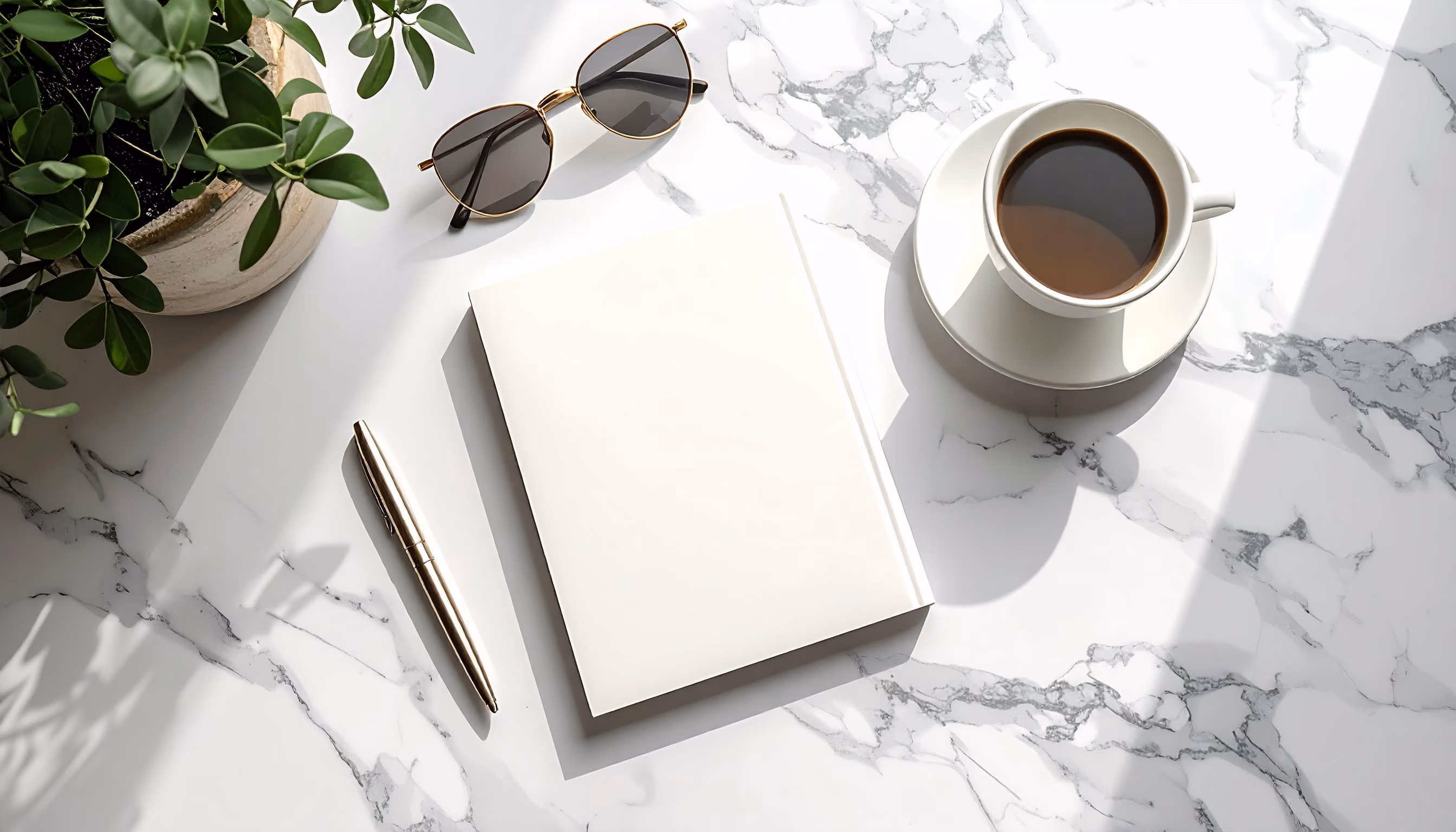 Discover a stylish white marble table featuring elegant gray patterns, complemented by a potted plant, a golden pen, sunglasses, and a cup of coffee. The soft, natural lighting enhances the inviting a...