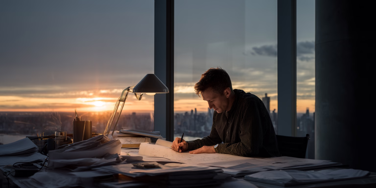 A focused man working on an architecture project at a desk filled with papers, featuring a stunning city view at sunset. The soft light from the desk lamp highlights the environment, showcasing the effort and dedication of the professional.