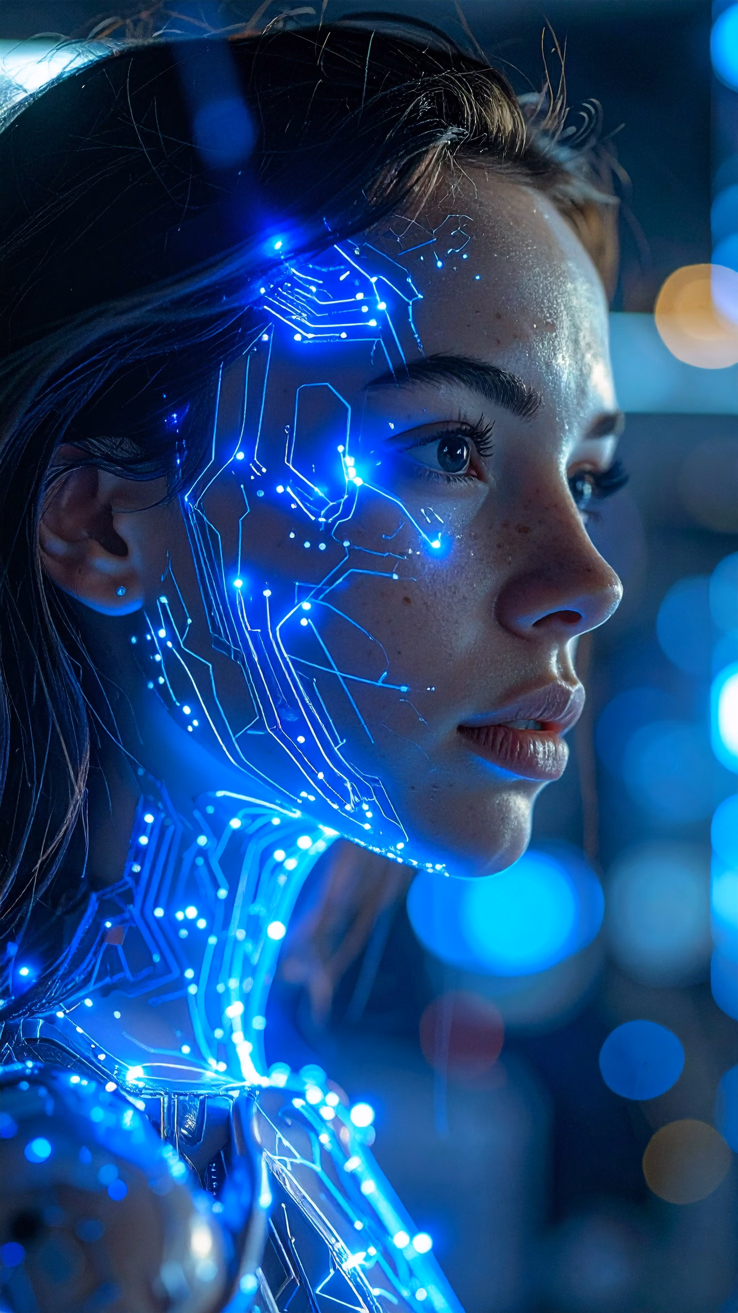 Futuristic Woman Profile Portrait with Bright Blue Circuit