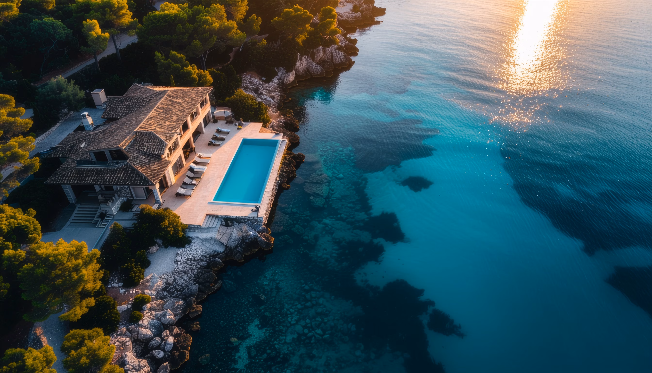 Experience the stunning aerial view of a luxurious seaside house featuring an infinity pool, surrounded by lush greenery and crystal-clear waters. The soft glow of the sunset creates a serene and elegant atmosphere, perfect for relaxation and inspiration.