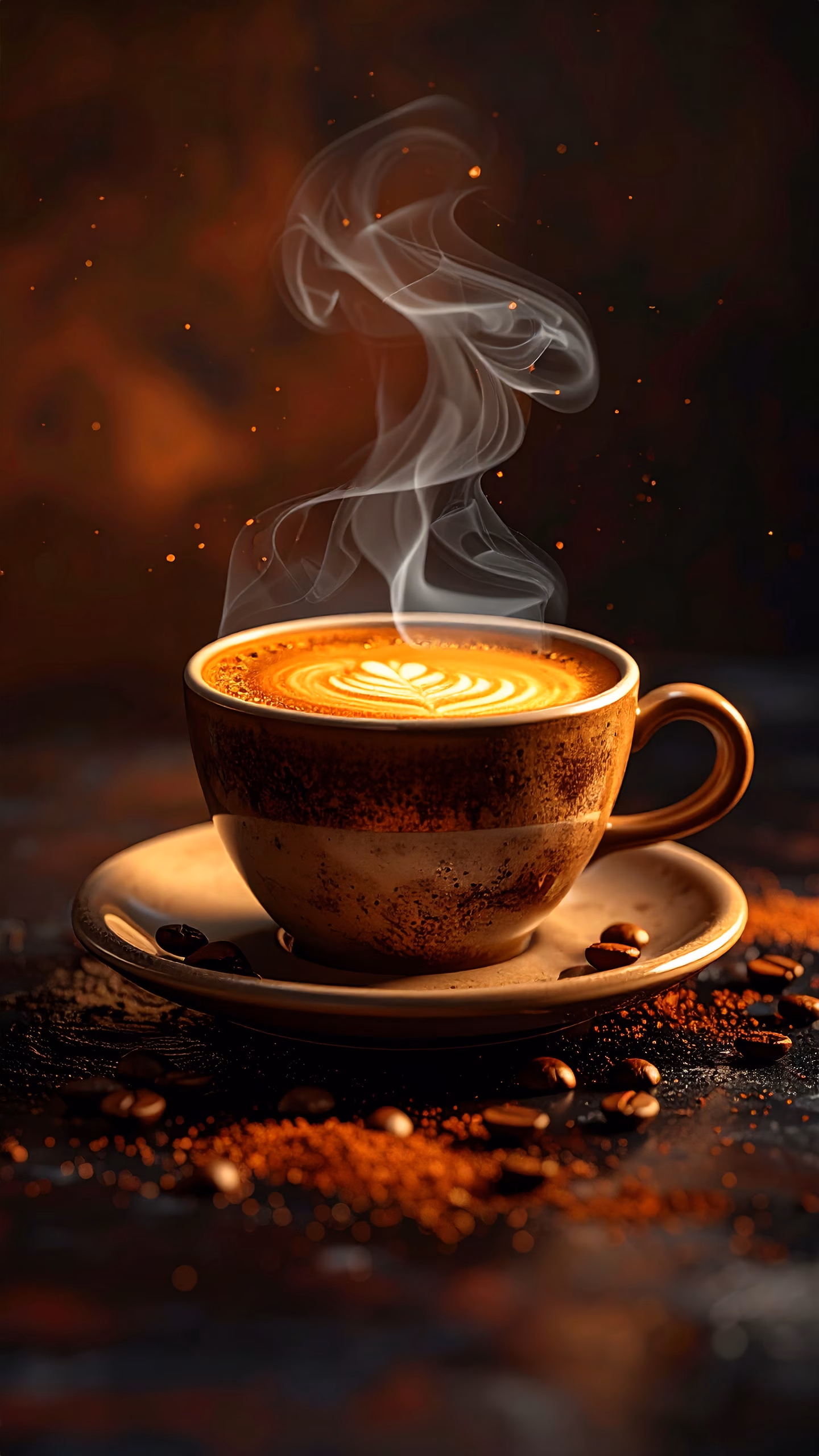 Discover this elegant coffee cup featuring beautiful latte art, surrounded by rich coffee beans and powder on a dark surface. The soft lighting enhances the swirling steam, creating a cozy and sophisticated atmosphere perfect for coffee lovers.