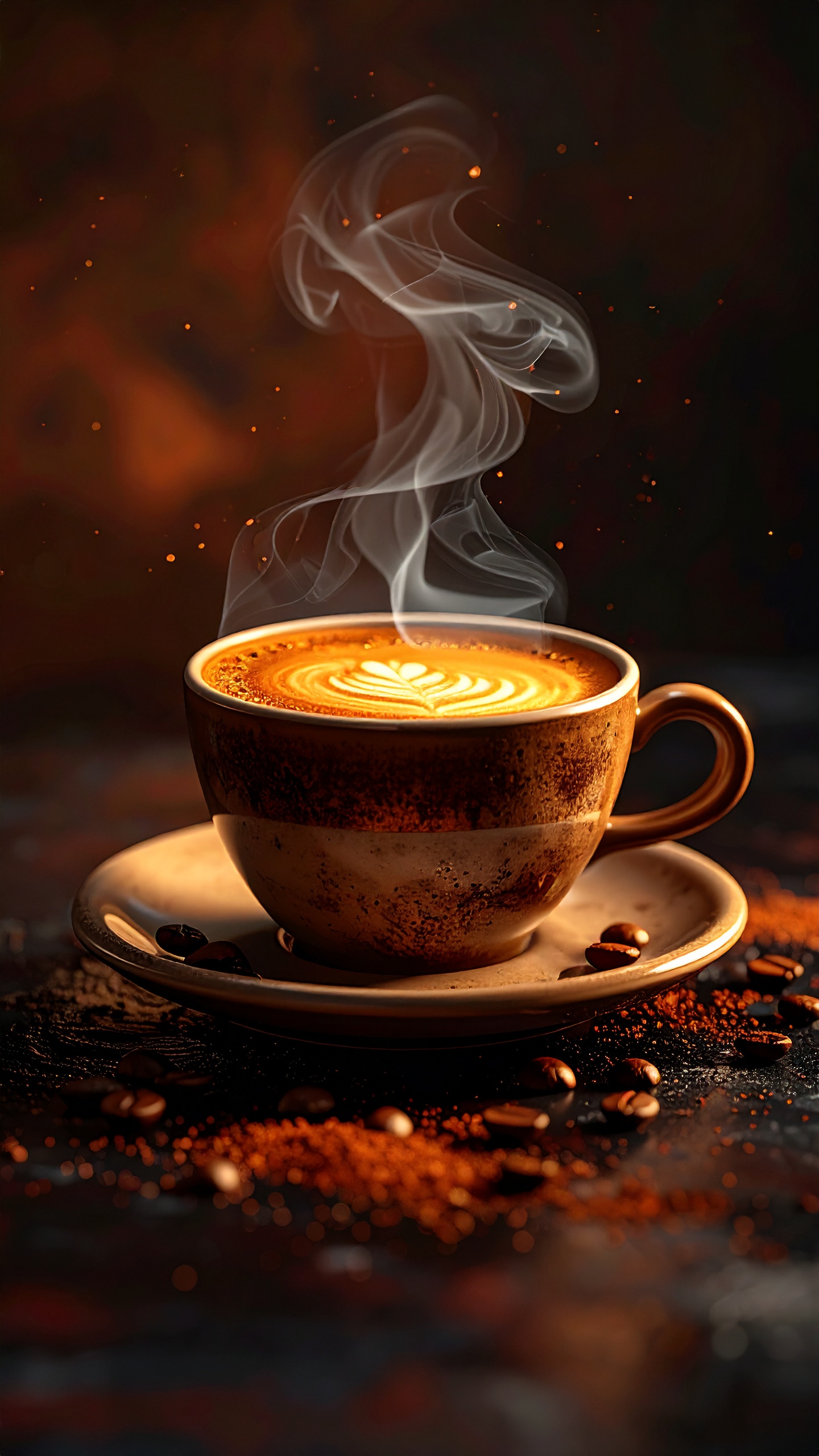 Discover this elegant coffee cup featuring beautiful latte art, surrounded by rich coffee beans and powder on a dark surface. The soft lighting enhances the swirling steam, creating a cozy and sophisticated atmosphere perfect for coffee lovers.