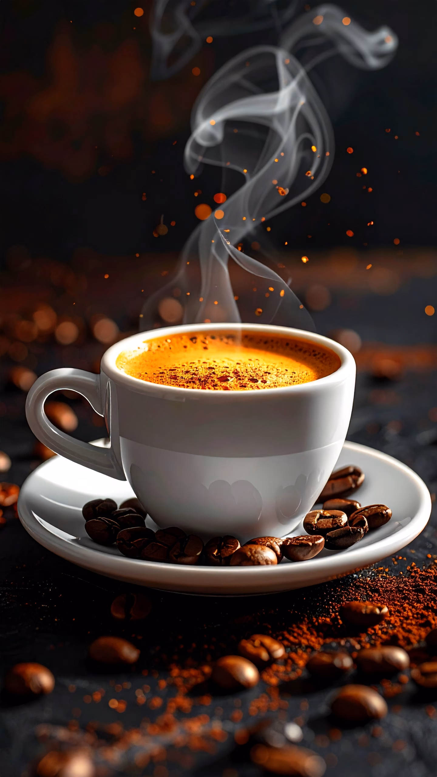 Experience the warmth of freshly brewed coffee in a white cup, elegantly placed on a saucer and surrounded by dark coffee beans. The gentle steam rises, illuminated by soft lighting, creating a cozy and sophisticated atmosphere. This composition highlights the contrast between the cup's shine and a深