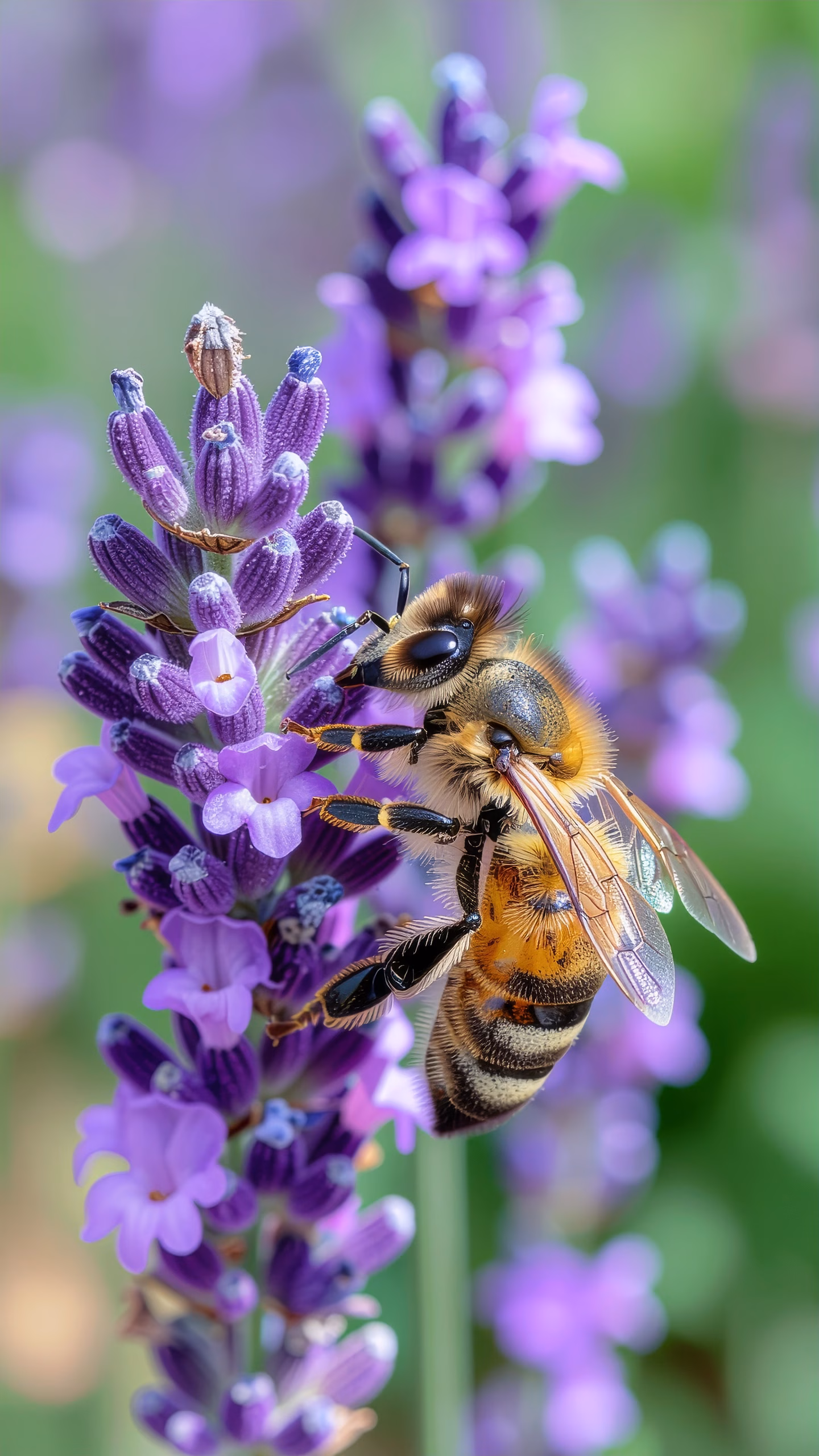 A bee delicately lands on vibrant lavender, captured in a detailed close-up. This image highlights the bee's translucent wings and the velvety texture of the purple flowers, illuminated by soft, natur...