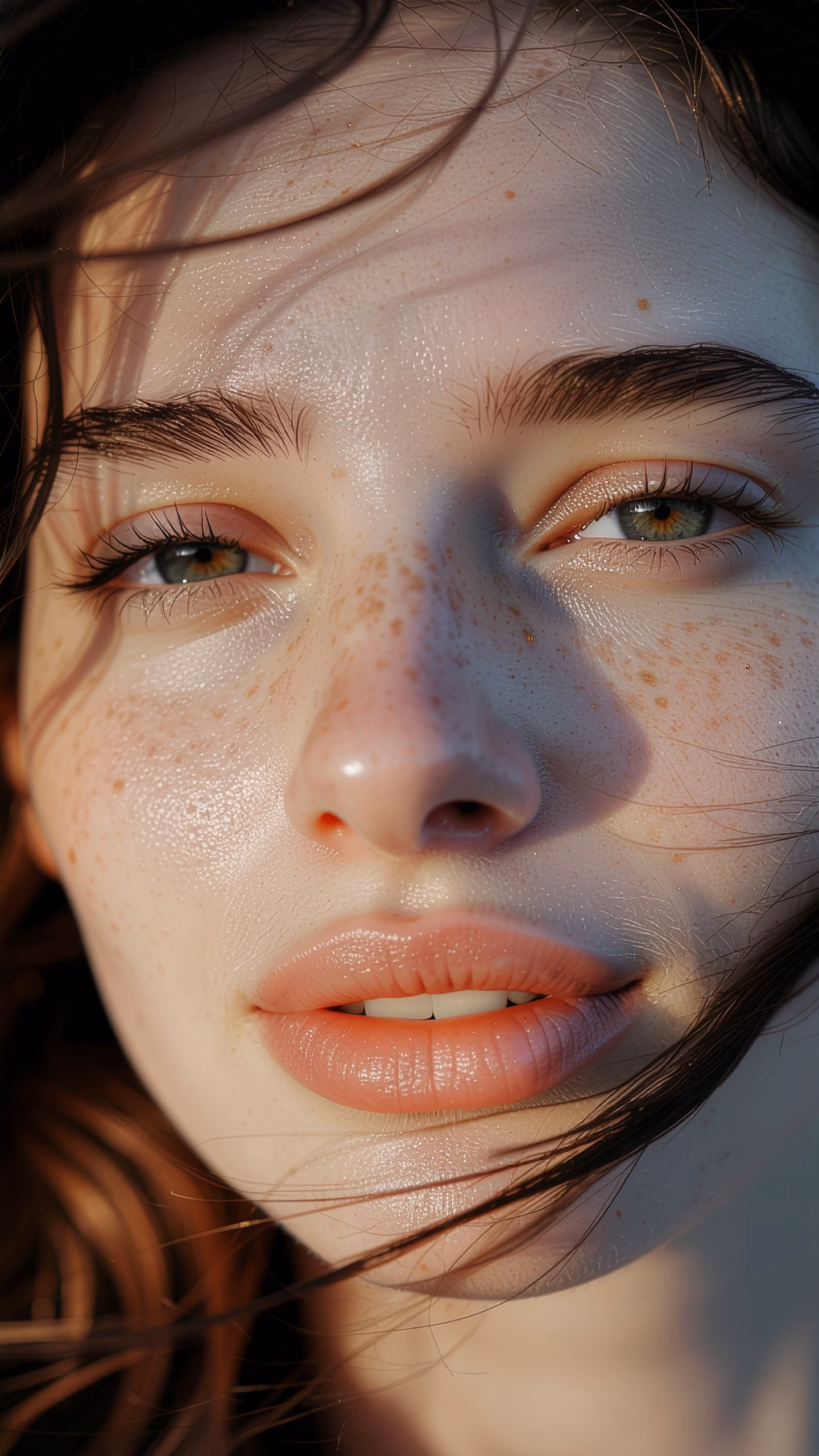 Close-up portrait of a person illuminated by sunlight, highlighting freckles and facial details. The composition emphasizes skin texture and expressive eyes, creating a natural and serene atmosphere. The interplay of light and shadow enhances delicate features, while wind-swept hair adds dynamism to