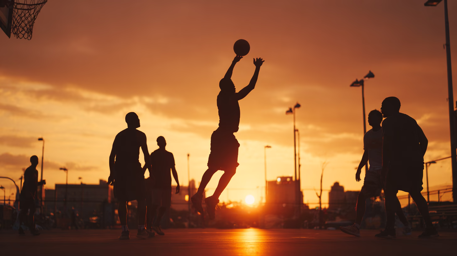 This image captures a dynamic basketball scene at sunset, where the silhouettes of players stand out against a vibrant background of orange and golden hues. A player is prominently jumping to make a basket, while others are positioned around the court. The lighting creates a dramatic effect, accentu