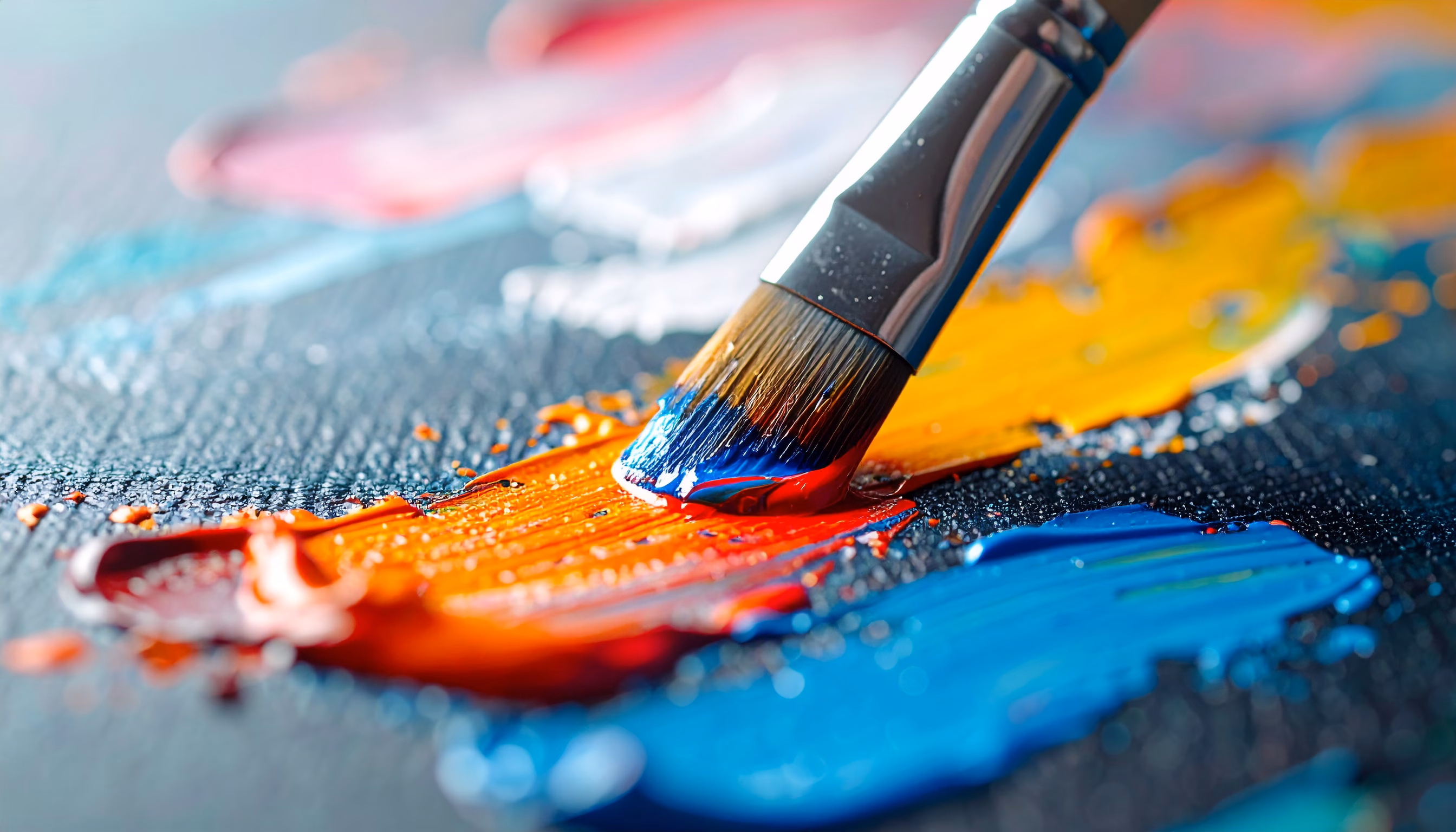 Discover vibrant brushstrokes in blue, orange, and red on a textured canvas, featuring a metallic brush in focus against a softly blurred background. Perfect for art enthusiasts looking to enhance their collection with striking colors and dynamic compositions.