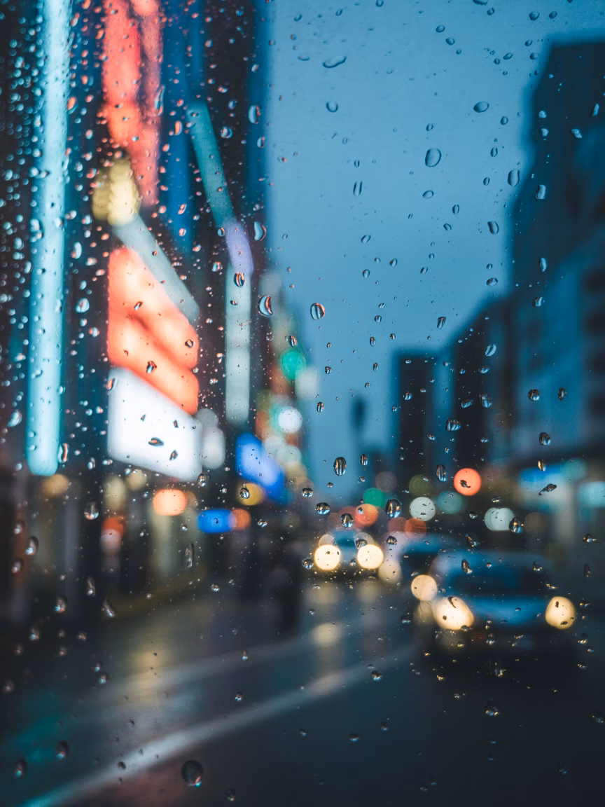 Experience the vibrant energy of a city at night with this stunning image captured through a rainy window. Colorful neon lights and car headlights create a beautiful bokeh effect, enhancing the lively atmosphere. The focus on the raindrops adds texture, while the blurred background emphasizes the in