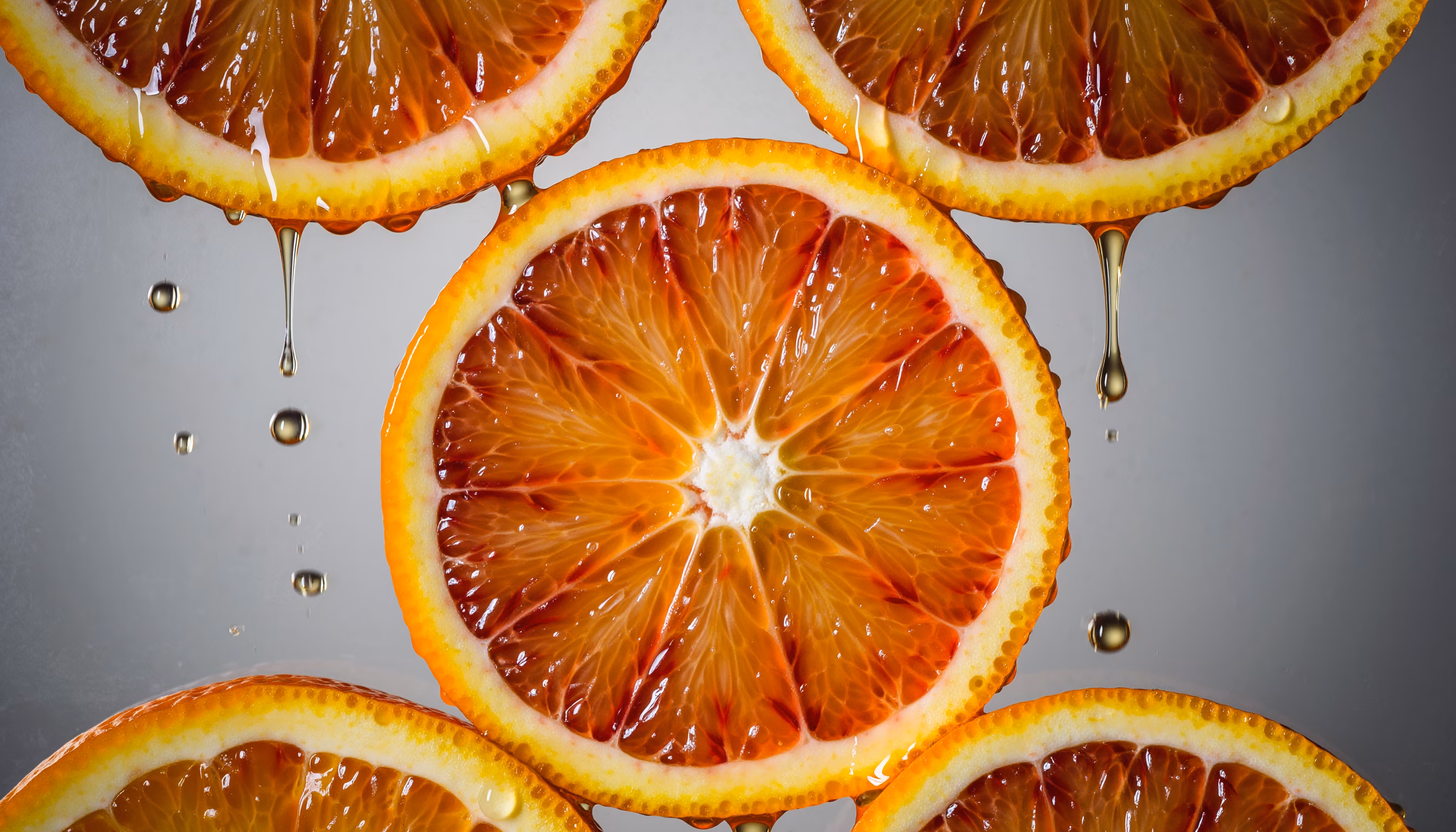 Discover the vibrant beauty of blood orange slices with juicy drips against a light gray background. The lighting enhances the bright orange and red hues of the fruit, creating a vivid and fresh contrast. This top-down composition and sharp focus highlight the succulent texture and intricate details