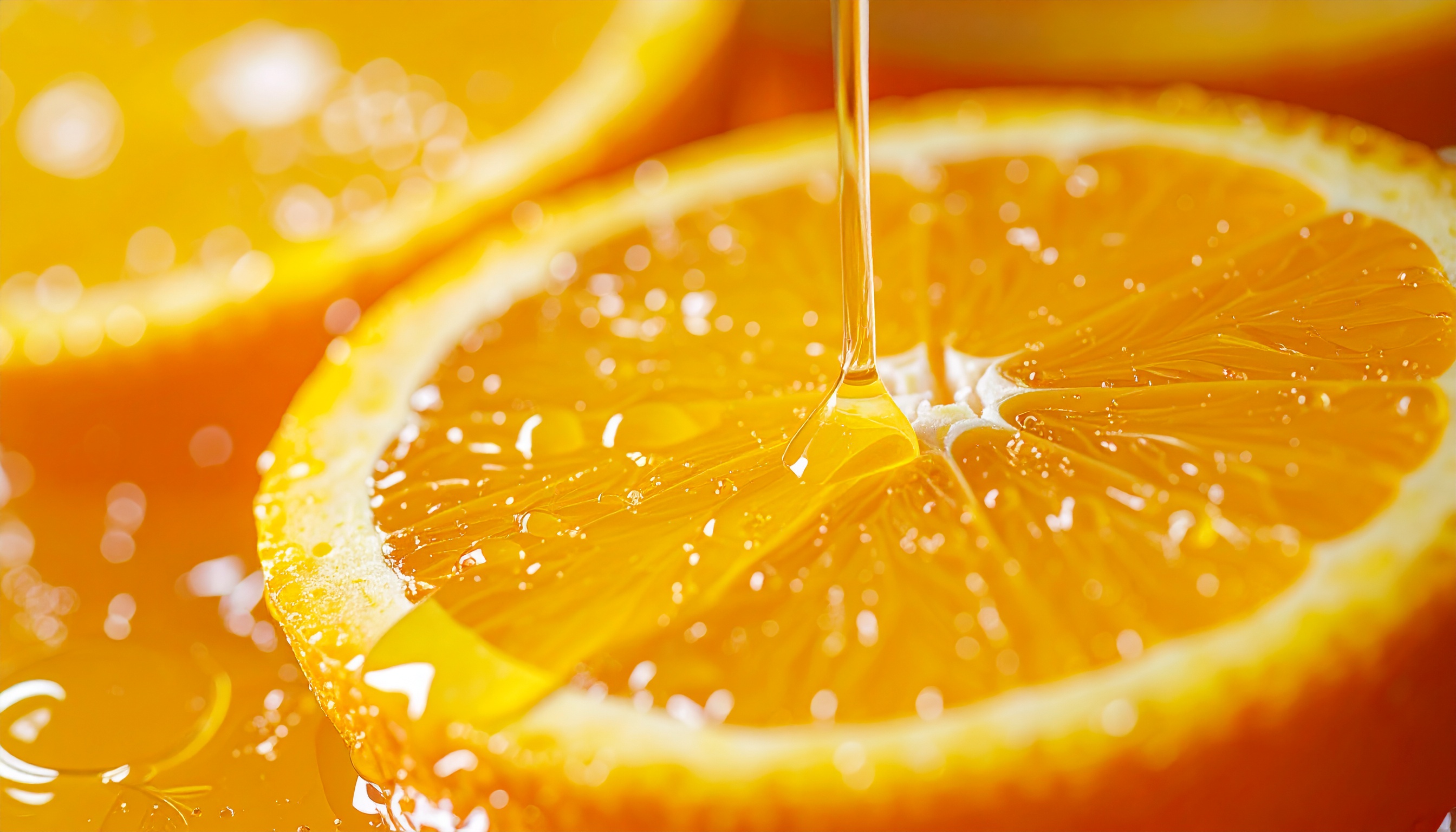 Close-up de fatia de laranja com mel escorrendo, capturando textura suculenta e frescor vibrante em luz dourada, transmitindo sensação de doçura natural e vitalidade.